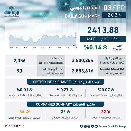 بلغ حجم التداول الإجمالي ليوم الثلاثاء 03/09/2024 حوالي (3.5) مليون دينار وعدد الأسهم المتداولة (2.9) مليون سهم، نفذت من خلال (2,056) عقداً.