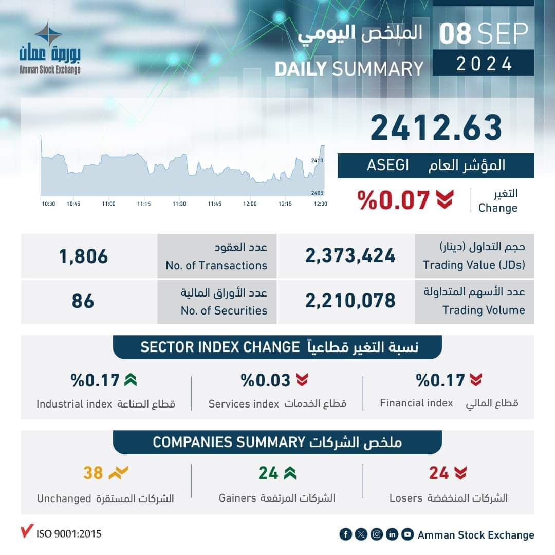 بلغ حجم التداول الإجمالي ليوم الأحد 08/09/2024 حوالي (2.4) مليون دينار وعدد الأسهم المتداولة (2.2) مليون سهم، نفذت من خلال (1,806) عقداً.