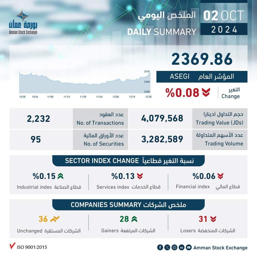 بلغ حجم التداول الإجمالي ليوم الأربعاء 02/10/2024 حوالي (4.1) مليون دينار وعدد الأسهم المتداولة (3.3) مليون سهم، نفذت من خلال (2,232) عقداً.