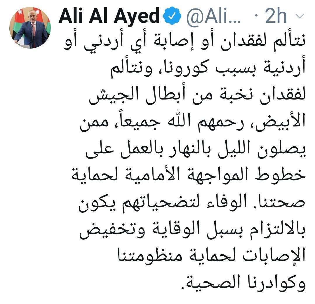 الخصاونة والعايد: نتألم لفقدان نخبة من أبطال الجيش الأبيض في معركة كورونا ( أسماء )