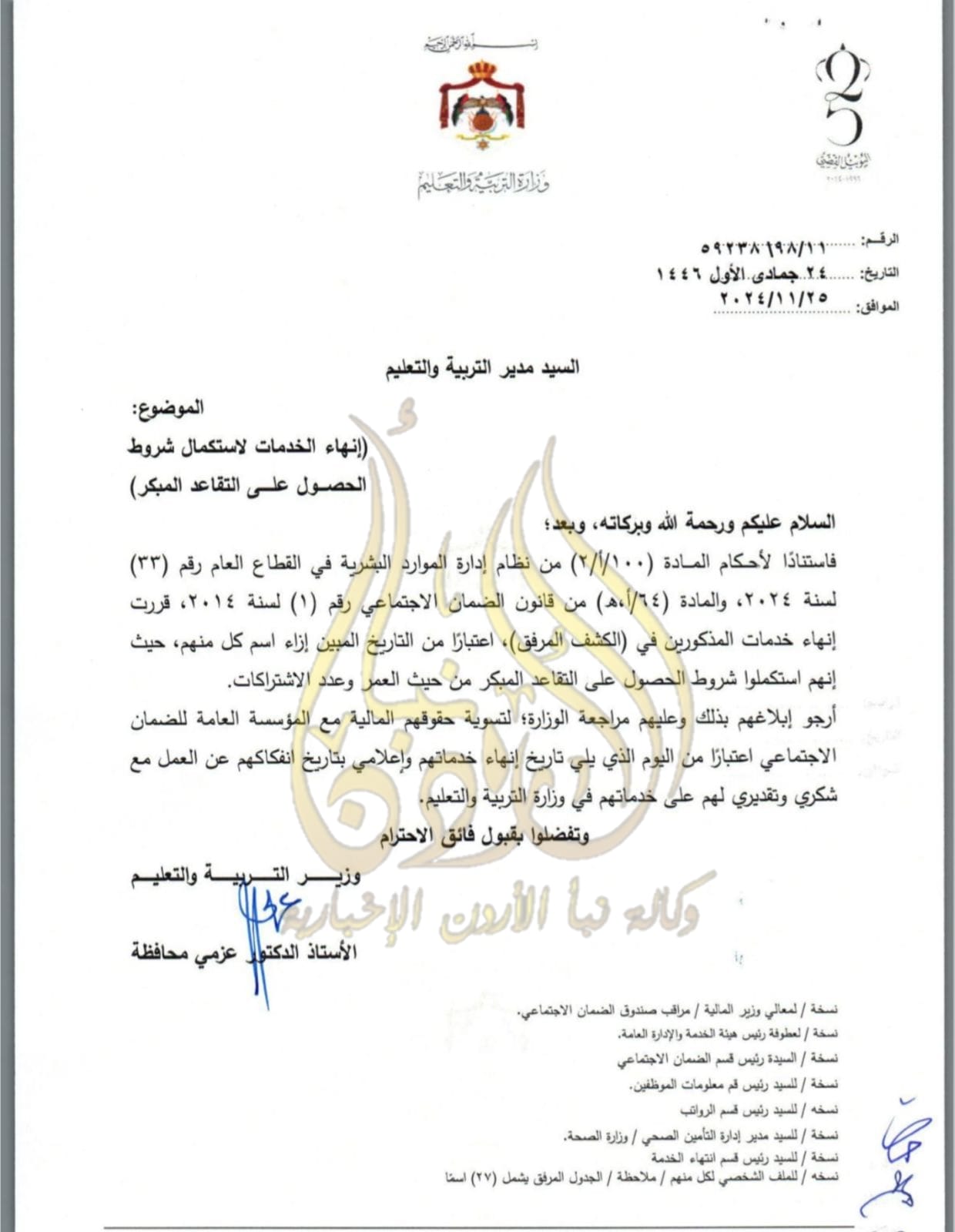 قرر وزير التربية والتعليم الدكتور عزمي محافظة انهاء خدمات موظفين بعد أن استكملو شروط الحصول على التقاعد المبكر من حيث العمر وعدد الاشتراكات .