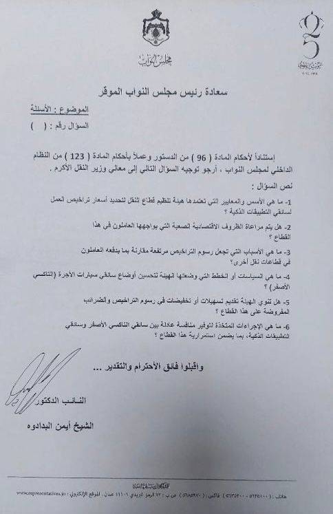 النائب أيمن البدادوة يمطر الحكومة بوابل من الأسئلة النيابية تتعلق بقطاعات حيوية