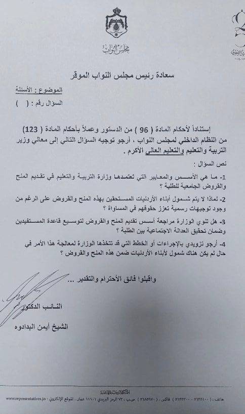 السؤال الثاني توجه به النائب إلى وزير التربية والتعليم والتعليم العالي، مستفسراً عن الأسس والمعايير التي تعتمدها الوزارة في تقديم المنح والقروض الجامعية. وشدد البدادوة على أهمية تحقيق العدالة في توزيع هذه المنح وضمان وصولها إلى مستحقيها.