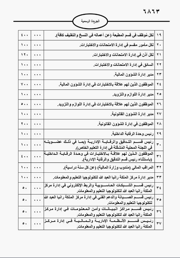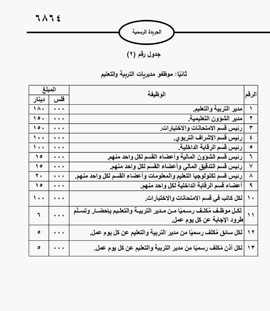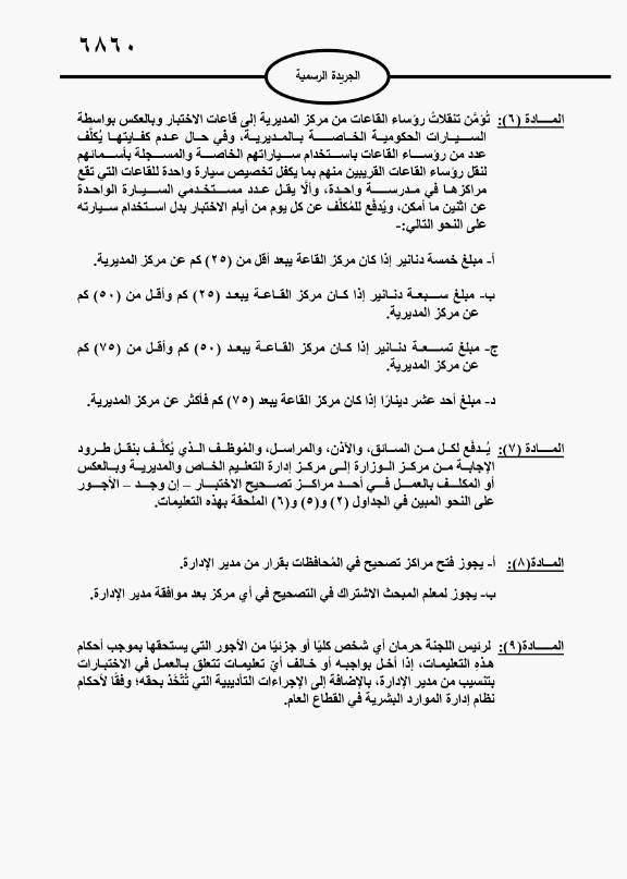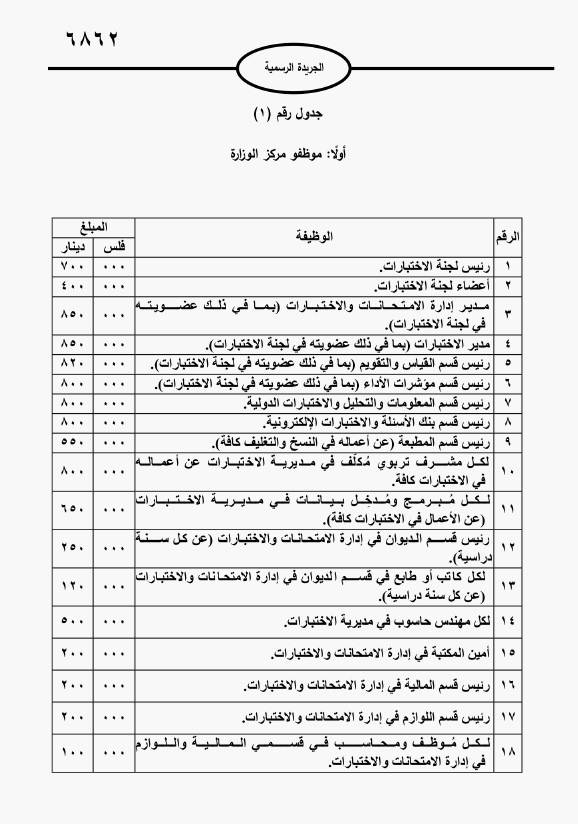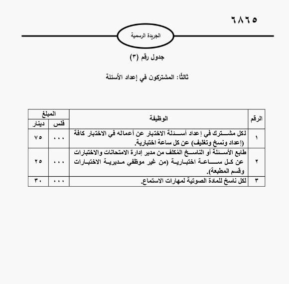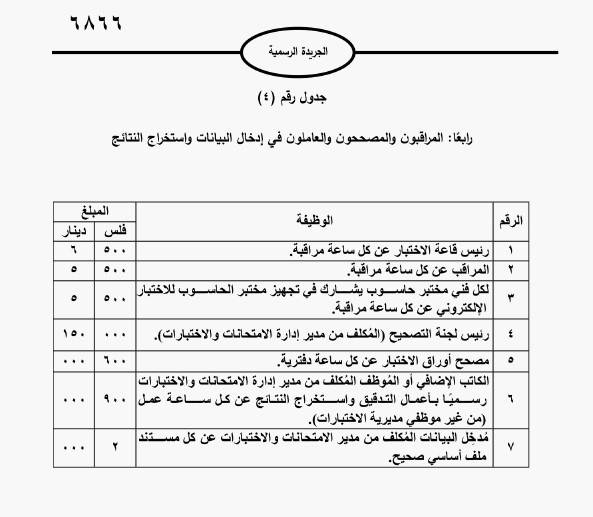ونصت المادة 15 من التعليمات على أنه تدفع أجور العاملين في الاختبارات على النحو المبين في الجداول (1، 2، 3، 4، 5، 6) الملحقة بهذه التعليمات.