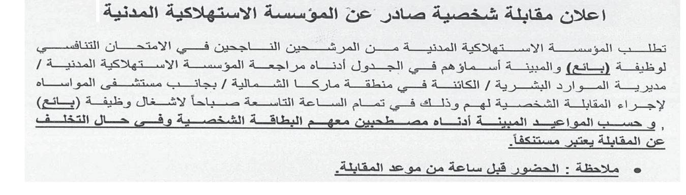 تدعو المؤسسة الاستهلاكية المدنية، عددا من المرشحين الناجحن بالامتحان التنافسي، إلى مراجعة المؤسسة، لإجراء المقابلات الشخصية على وظيفة بائع