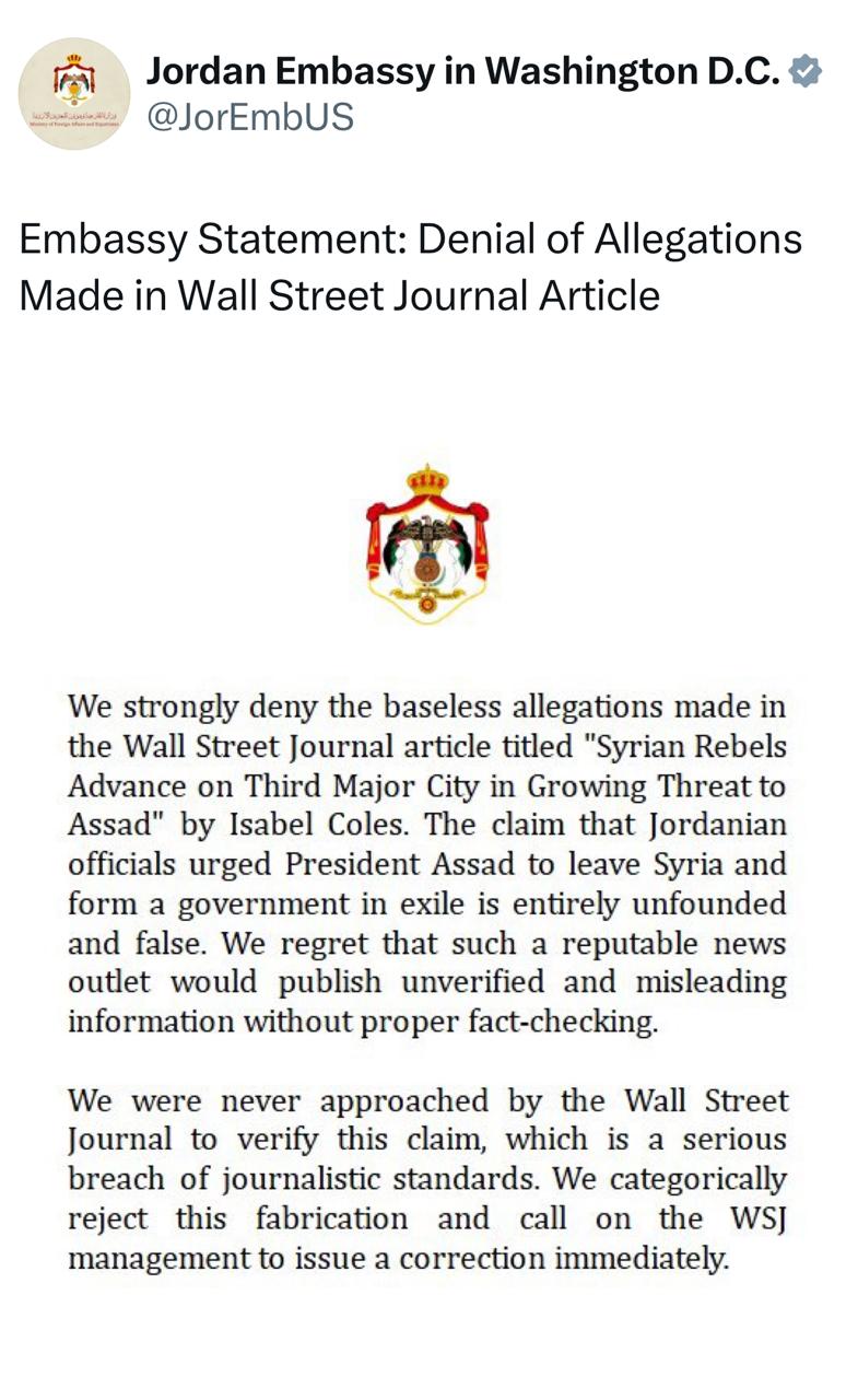 نفى بيان صادر عن السفارة الأردنية في واشنطن بشدة الادعاءات التي لا أساس لها والتي وردت في مقالة صحيفة وول ستريت جورنال بعنوان "المتمردون السوريون يتقدمون نحو ثالث أكبر مدينة في تهديد متزايد للأسد" بقلم إيزابيل كولز.