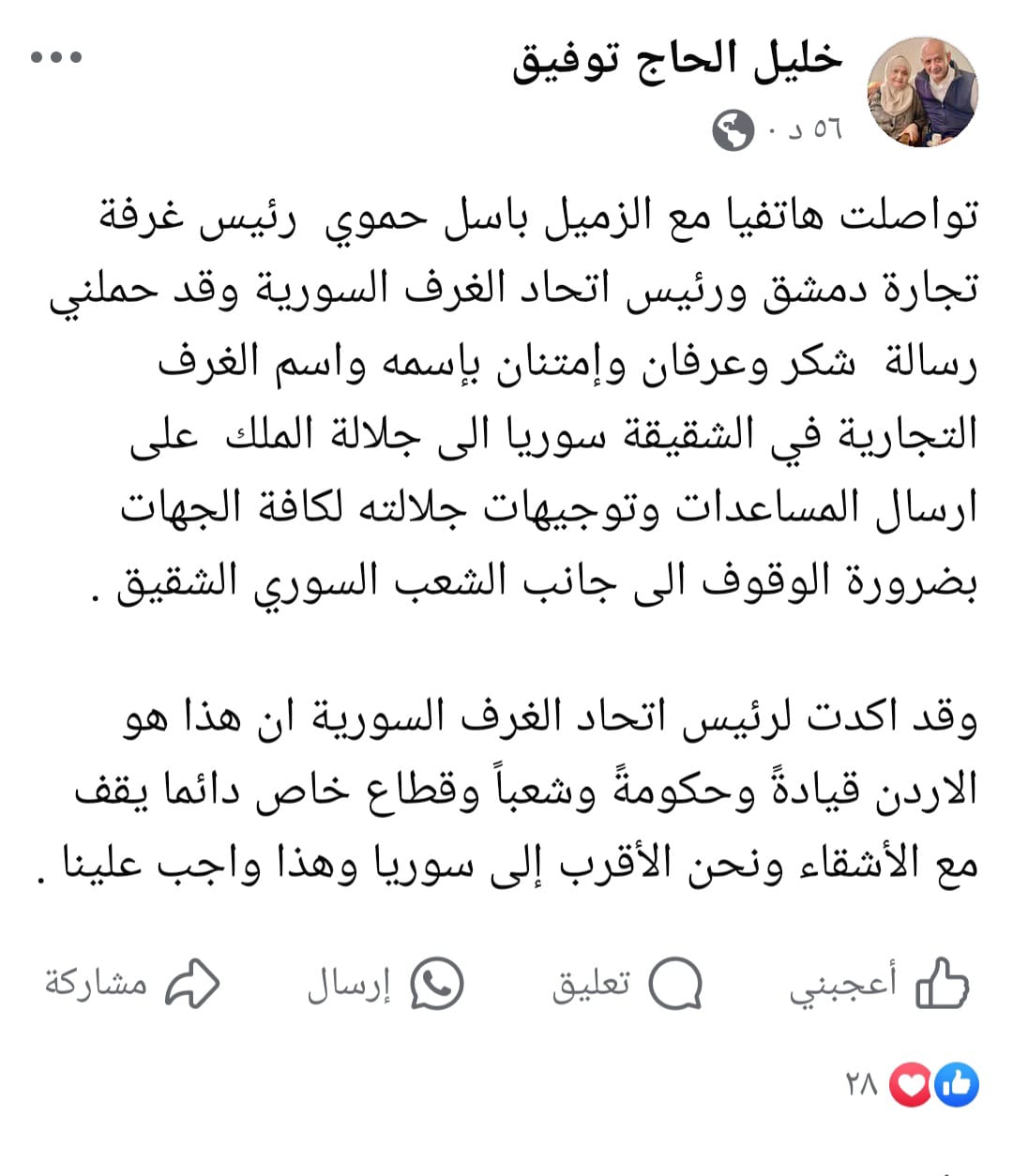 وكتب الحاج توفيق على صفحته (الفيس بوك) انه اجرى اتصالا هاتفيا مع الحموي، وأكد الحاج توفيق خلال الاتصال أن جلالة الملك قد وجه كافة الجهات المعنية بتقديم كل ما يلزم من مساعدات للشعب السوري، مشيراً إلى عمق العلاقات الأخوية التي تربط الأردن وسوريا.