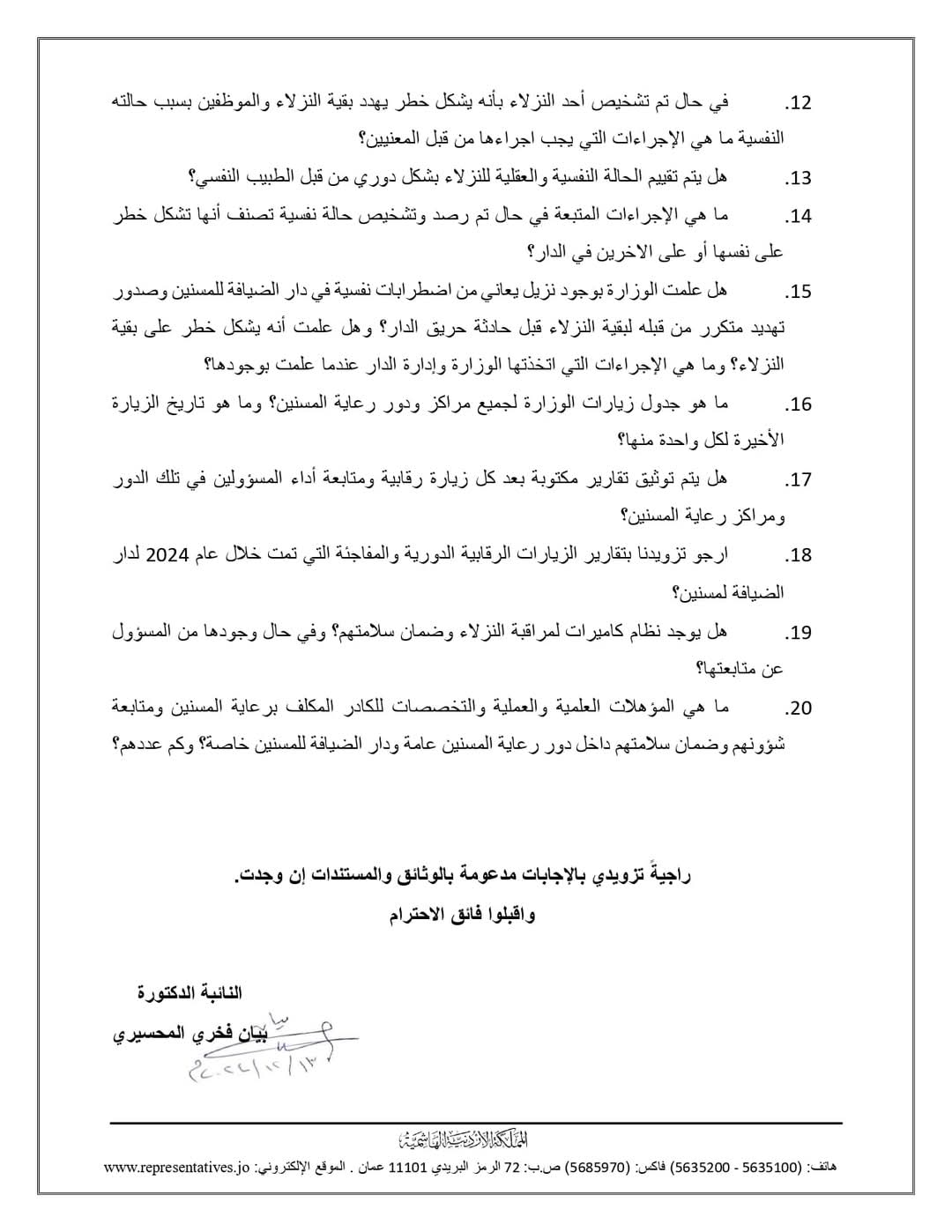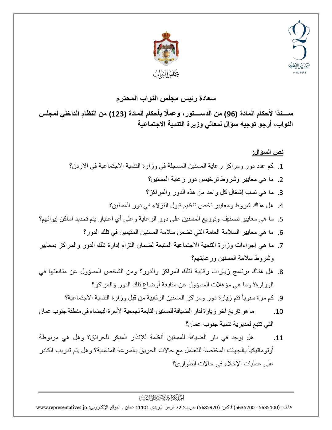أُقدم اليوم مجموعة من الأسئلة الاستفهامية موجهة لمعالي وزيرة التنمية الاجتماعية للوقوف على ملابسات القضية، ودراسة وضع دور رعاية المسنين في الأردن والخدمات المقدمة لهم.