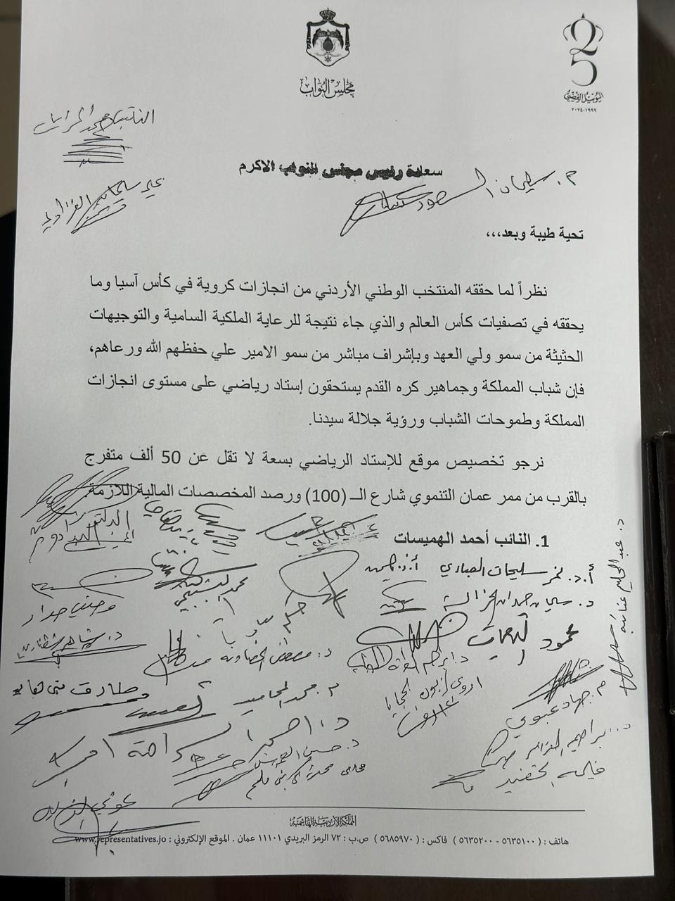 الهميسات يتبنى مذكرة لبناء ملعب كرة قدم تقديراً لإنجازات المنتخب الوطني
