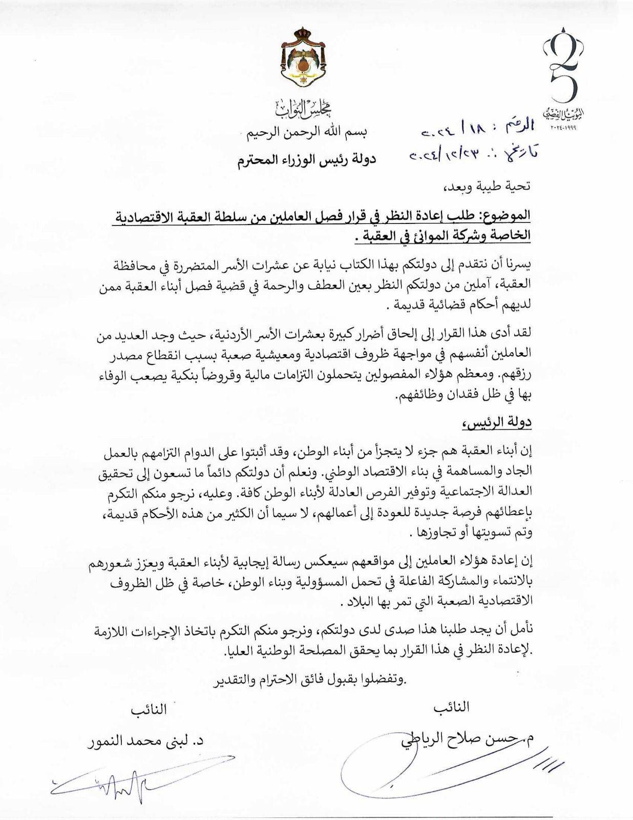 يسرنا أن نتقدم إلى دولتكم بهذا الكتاب نيابة عن عشرات الأسر المتضررة في محافظة العقبة، آملين من دولتكم النظر بعين العطف والرحمة في قضية فصل أبناء العقبة ممن لديهم أحكام قضائية قديمة .