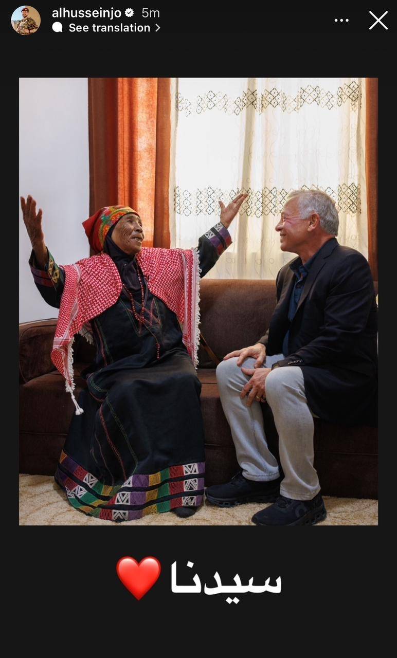 وأدرج ولي العهد عبر خاصية ستوري في منصة "إنستغرام” صورة لجلالة الملك بصحبة سيدة مسنة من سكان لواء دير علا، وعلق عليها "سيدنا”.
