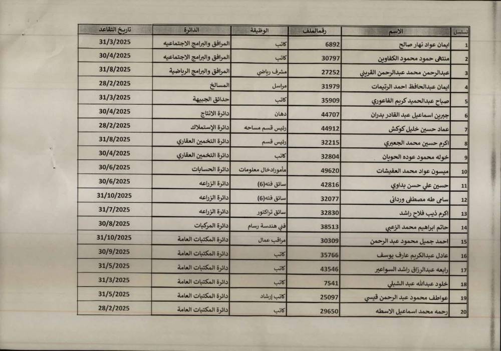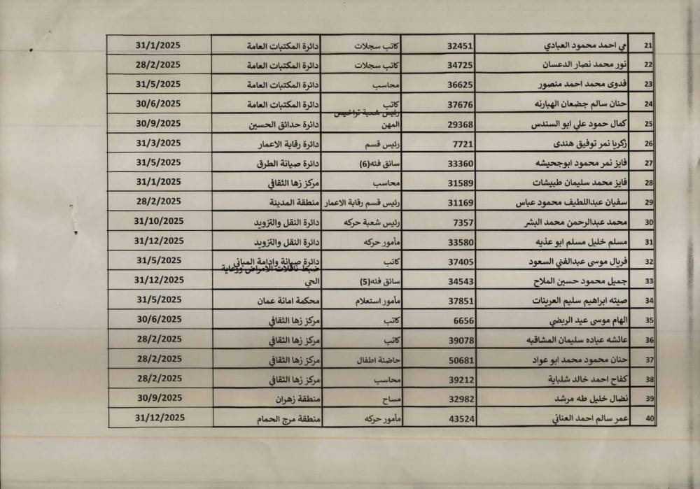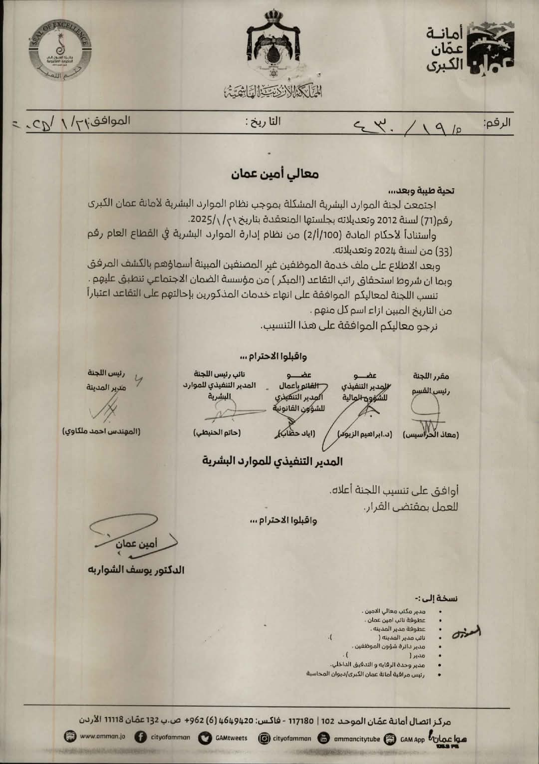 بناء على تنسيب لجنة الموارد البشرية، قرر أمين عمان إحالة عدد من الموظفين غير المصنفين، إلى التقاعد المبكر.