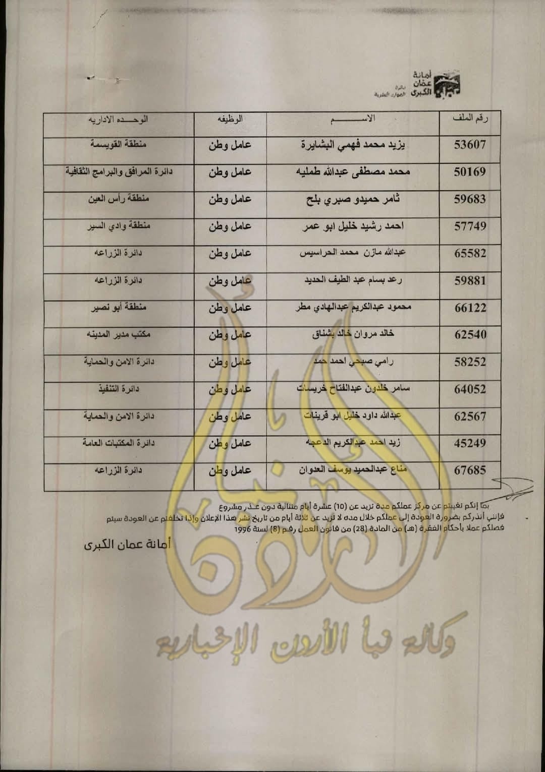 أمانة عمان لهؤلاء : العودة للعمل أو الفصل (أسماء)