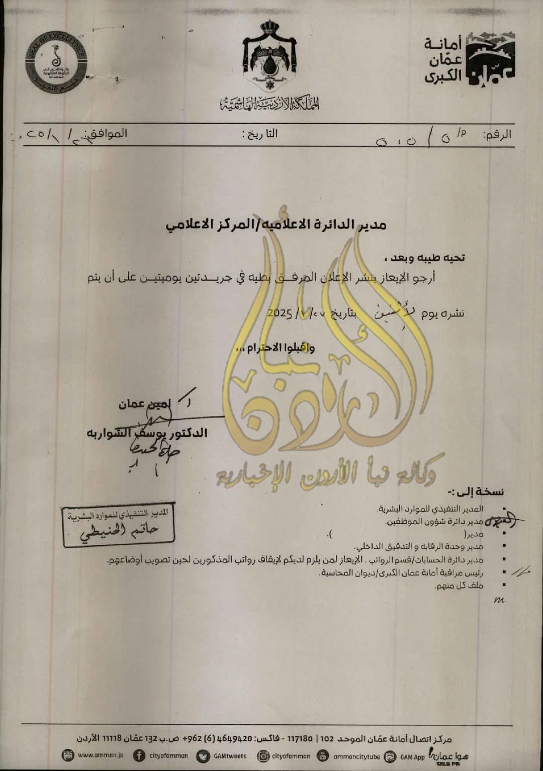 أصدرت أمانة عمان الكبرى تعميمًا إداريًا جديدًا موجهًا للموظفين المتغيبين عن العمل لمدة تتجاوز عشرة أيام متتالية، دون عذر رسمي أو موافقة مسبقة.