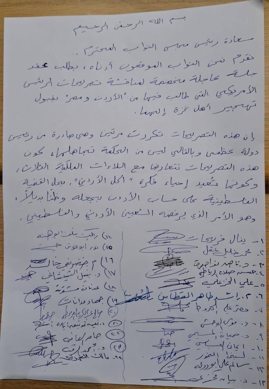 قام النائب ينال فريحات بتقديم مذكرة نيابية يطالب فيها بعقد جلسة عاجلة مخصصة لمناقشة تصريحات الرئيس الأمريكي التي طالب فيها من الأردن ومصر بقبول تهجير أهل غزة، وقام عدد من النواب بالتوقيع عليها