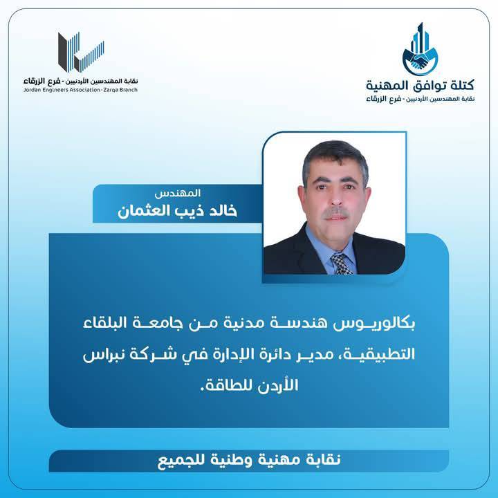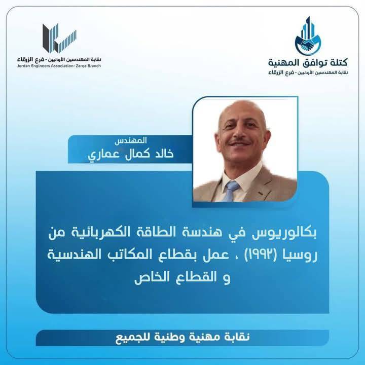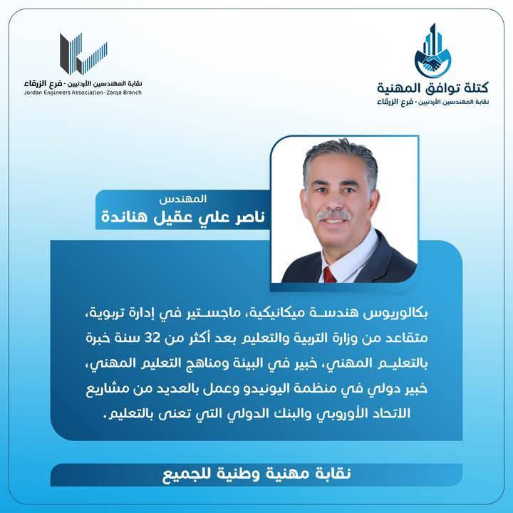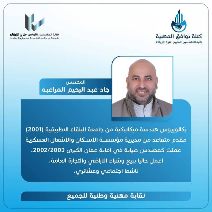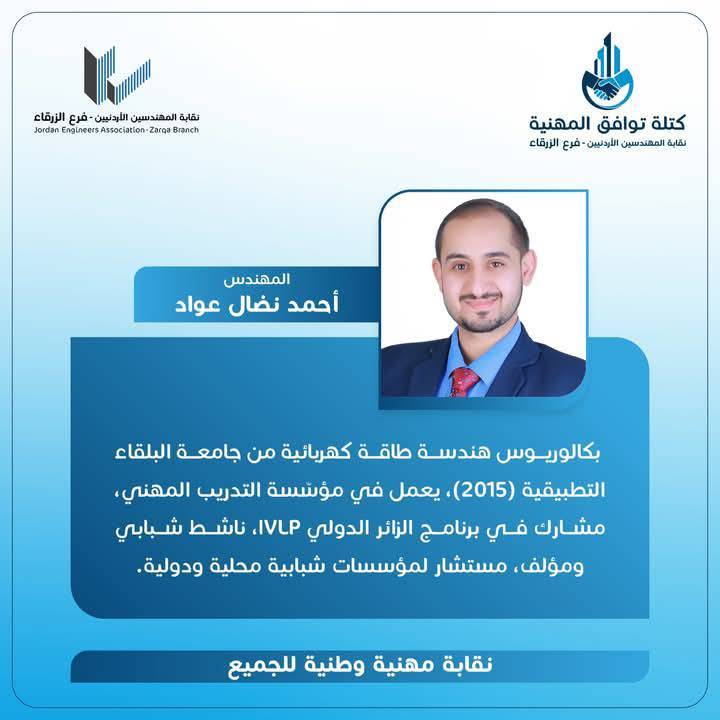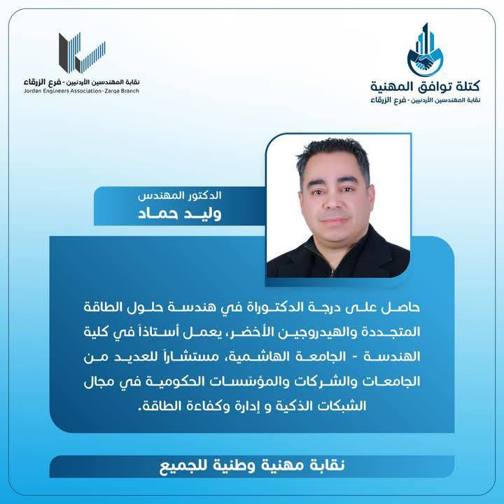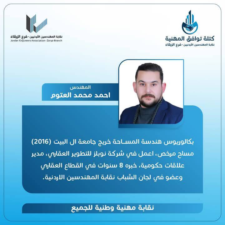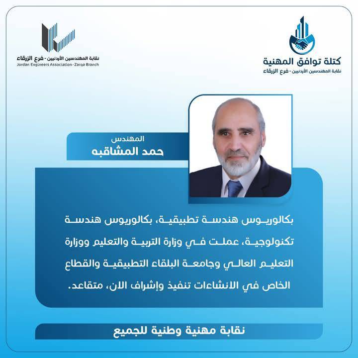 الحمدللّه رب العالمين، والشكر الجزيل الموصول لجميع الاخوات والأخوة المهندسين وقادة المؤسسات الشبابية وأبناء المجتمع المحلي بالزرقاء و الوطن لدعمهم كتلة توافق المهنية، مما أثمر عدم وجود منافسين واستحقاق الفوز بالتزكية للرئيس و أعضاء الهيئة المركزية التي أتشرف أنني ضمنهم.