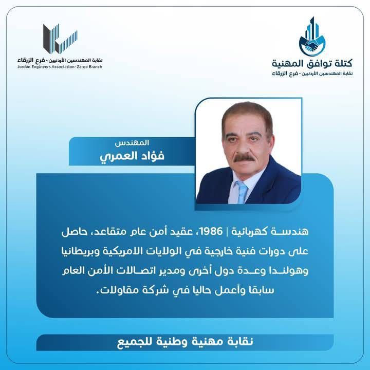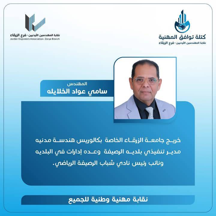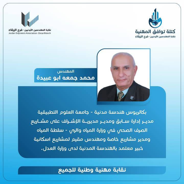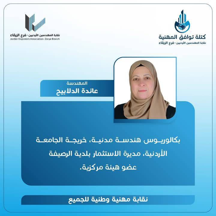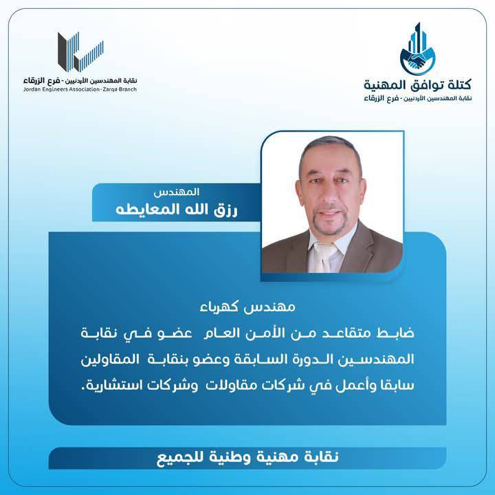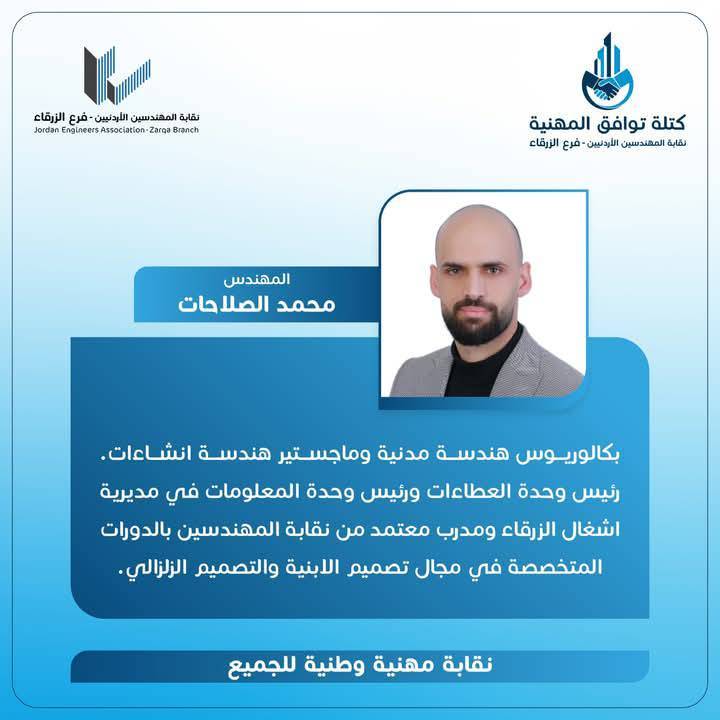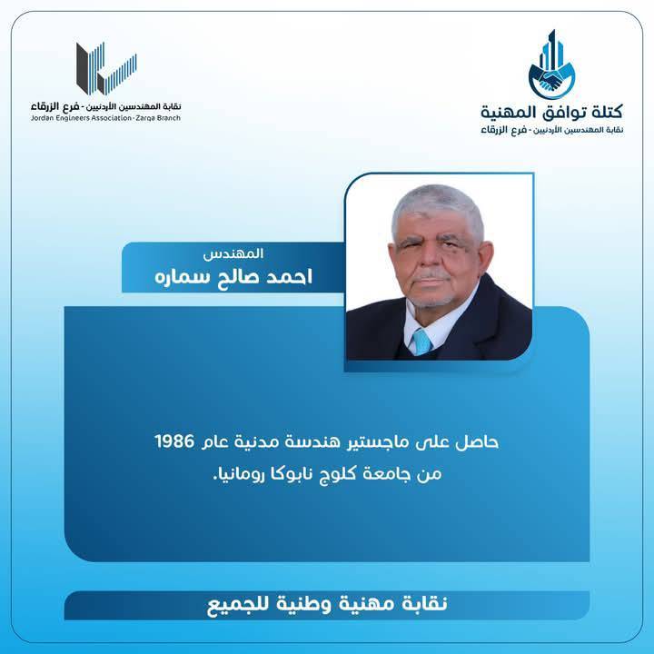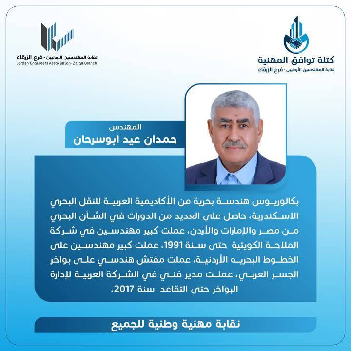 الحمدللّه رب العالمين، والشكر الجزيل الموصول لجميع الاخوات والأخوة المهندسين وقادة المؤسسات الشبابية وأبناء المجتمع المحلي بالزرقاء و الوطن لدعمهم كتلة توافق المهنية، مما أثمر عدم وجود منافسين واستحقاق الفوز بالتزكية للرئيس و أعضاء الهيئة المركزية التي أتشرف أنني ضمنهم.