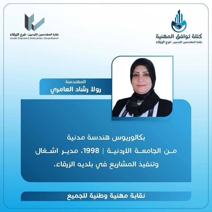 وبكل تأكيد سنعمل بشكل كبير على تعزيز برامج التدريب المتخصص وبالتعاون مع المؤسّسات التدريبية بالقطاعات كافة، ولا سيما مؤسّسة التدريب المهني التي أتشرف أنني ضمن فريق عملها، والعمل بتشاركية وتكاملية مع كافة الجهات المعنية بتطوير قطاع العمل الهندسي بمحافظة الزرقاء بهدف تطوير المهارات للزملاء والزميلات المهندسين بما يتوافق مع مهارات المستقبل واحتياجات أسواق العمل المحلية والدولية.