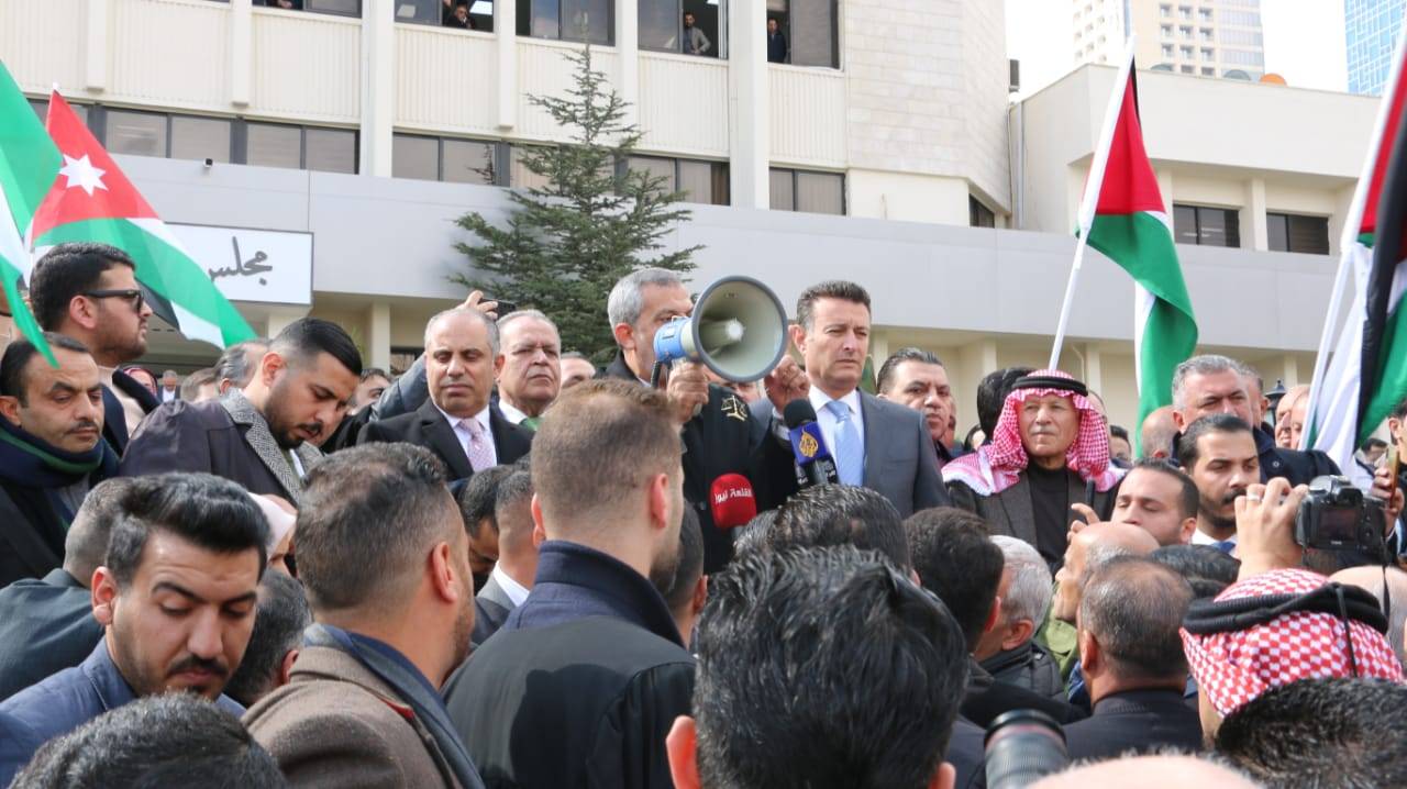 وقال نقيب المحامين يحيى ابوعبود، ان موقف النقابة المشرف ينسجم مع تاريخها وحاضرها ومستقبلها، في ساحات العدالة، ومن رزمز العدالة والمساواة والحكمة في الدولة الاردنية، جئنا إلى ساحات التشريع مجلس الأمة رمز الشعب الاردني ورمز الدولة الأردنية، نحمل رسالة واحدة بأننا جميعا في هذا الوطن نساند الموقف التاريخي والسياسي والوطني للأردن وقيادته الهاشمية الحكيمة بوقوفه سدا منيعا ضد دعوات التهجير لشعبنا الفلسطيني البطل وان هذه الدعوات لن تلاقي الا وطننا أردنيا صلبا بترابه وأبناءه وجيشه وقيادته الهاشمية بلاءاته لا التهجير لا للوطن البديل نعم لقيام الدولة الفلسطينية المستقلة.