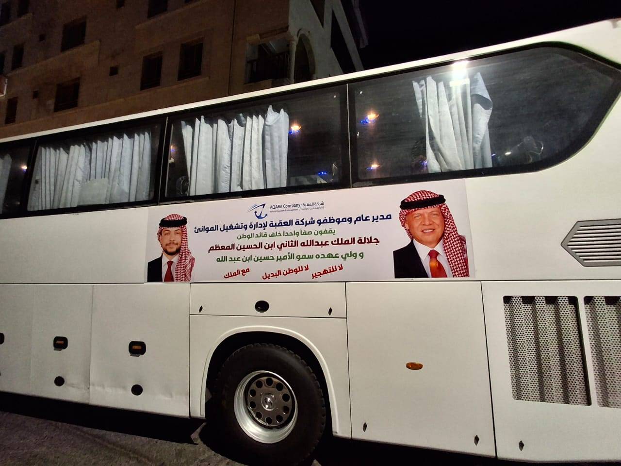 وانطلقت باصات وسيارات الموانئ مزينة بصور جلالة الملك والإعلام الأردنية وسط الاهازيج الوطنيه من مدينة العقبة.