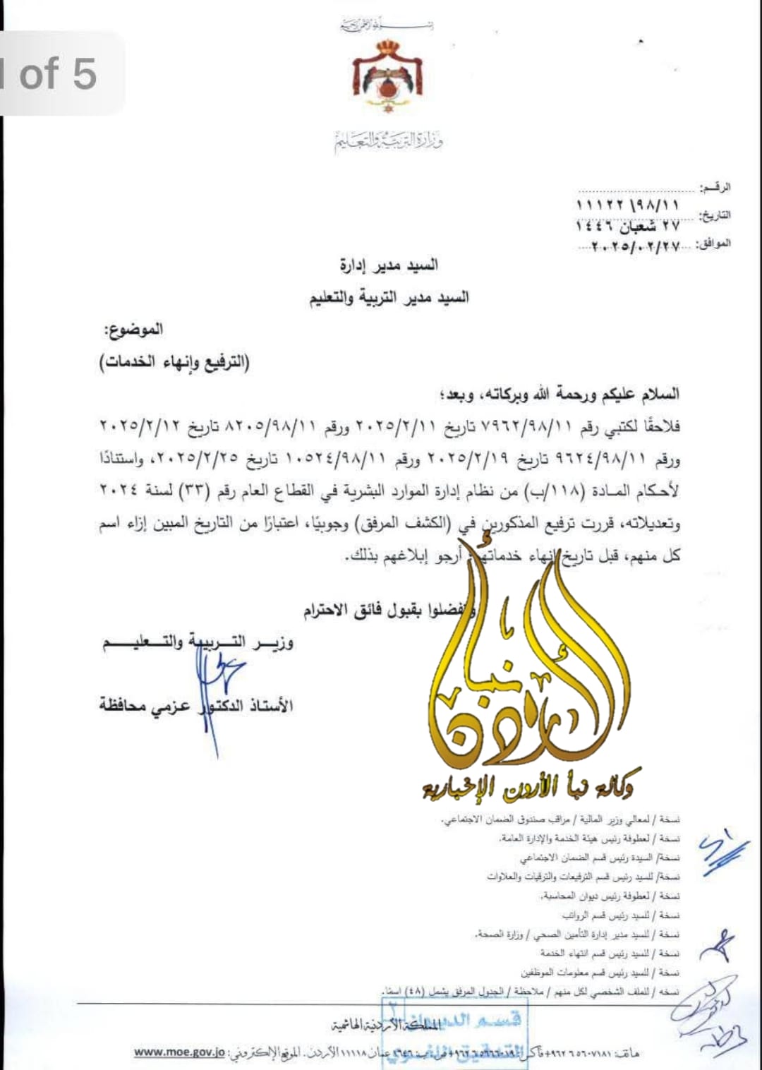 عاجل - ترفيعات وإنهاء خدمات في وزارة التربية والتعليم (أسماء)