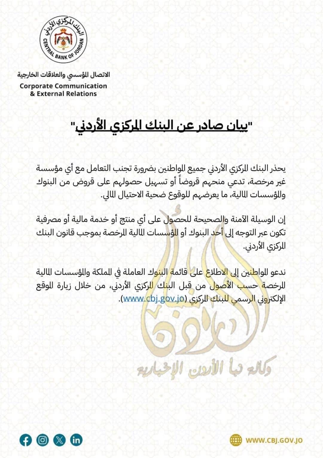 حذر البنك المركزي الأردني، المواطنين من التعامل مع أية مؤسسات غير مرخصة تدعي تسهيل حصولهم على قروض من البنوك، خشية وقوعهم ضحايا عمليات احتيال.