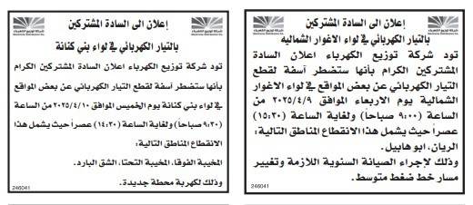أعلنت شركة توزيع الكهرباء عن فصل التيار الكهربائي عن مناطق في لواءي الأغوار الشمالية وبني كنانة يومي الأربعاء والخميس المقبلين. وقالت إن فصل التيار الكهربائي عن المناطق المذكورة في الإعلان المنشور بالصحف اليومية يأتي لغايات إجراء الصيانة السنوية وتغيير مسار خط ضغط متوسط بالإضافة لكهربة محطة جديدة.
