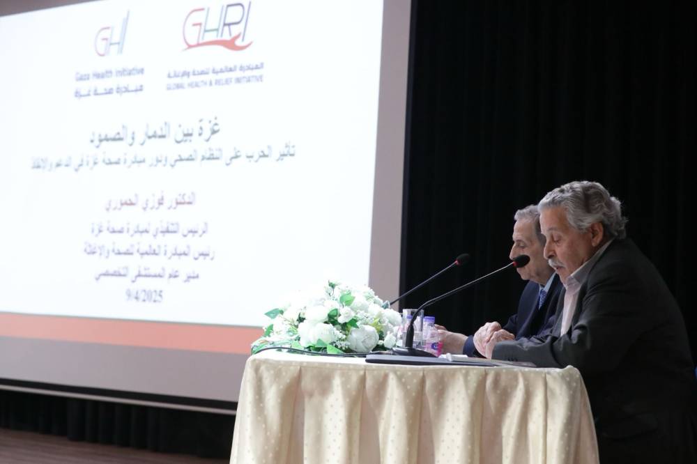 وفي السياق،أوضح الحموري في محاضرته أن ما يشهده قطاع غزة من قتل وتشريد وحرمان من أبسط حقوق الإنسان من غذاء وماء ومأوى ورعاية صحية..إلخ..، إنما يجري على مرأى ومسمع من العالم بأسره، في ظل تقاعس دولي مقلق، ما يدعو لمزيد من التحرك الفعّال والضغط من أجل وقف العدوان وتقديم العون للأهل هناك. ومن الامثلة البارزة على هذا العون ماتم تحقيقه من خلال مبادرة "صحة غزة"، التي أُطلقت في شباط/ فبراير 2024 خلال المؤتمر الدولي الأول لإعادة بناء القطاع الصحي في قطاع غزة، حيث تمكّن الدكتور الحموري وصحبه من تجسيد رؤية استراتيجية ملموسة. المبادرة، التي تضم اليوم أكثر من 50 منظمة دولية كشركاء، أصبحت مركزًا عالميًا لتنسيق وتيسير ودعم الجهود الإنسانية والصحية.