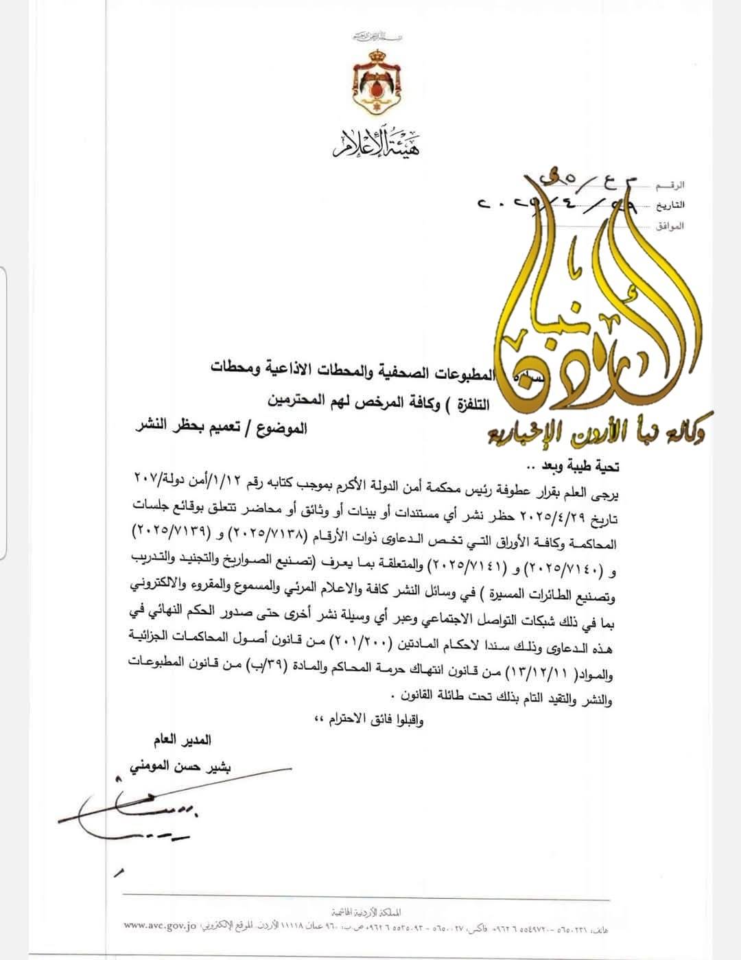 قرر رئيس محكمة أمن الدولة، الثلاثاء، حظر نشر أي مستندات أو بينات أو وثائق أو محاضر تتعلق بوقائع جلسات المحاكمة والمتعلقة بما بعرف (تصنيع الصواريخ والتجنيد والتدريب وتصنيع الطائرات المسيرة)، في وسائل النشر كافة والإعلام المرئي والمسموع والمقروء بما في ذلك شبكات التواصل الاجتماعي وعبر أي وسيلة نشر أخرى حتى صدور الحكم النهائي.