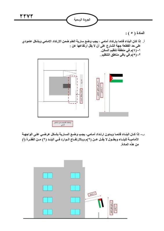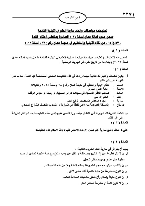نشرت الحكومة في الجريدة الرسمية، الأربعاء، تعليمات مواصفات وأبعاد سارية العلم في الأبنية القائمة ضمن حدود أمانة عمان لسنة 2025.