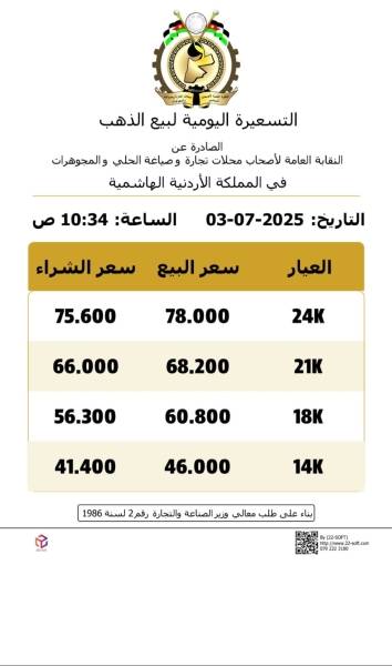 وأظهرت النشرة الرسمية للنقابة ارتفاع أسعار بيع وشراء مختلف عيارات الذهب، حيث سجّل عيار 21 - الأكثر طلبًا وتداولًا في السوق المحلي - 68.200 دينار لبيع الغرام الواحد، فيما بلغ سعر الشراء من المواطنين 66.000 دينار.