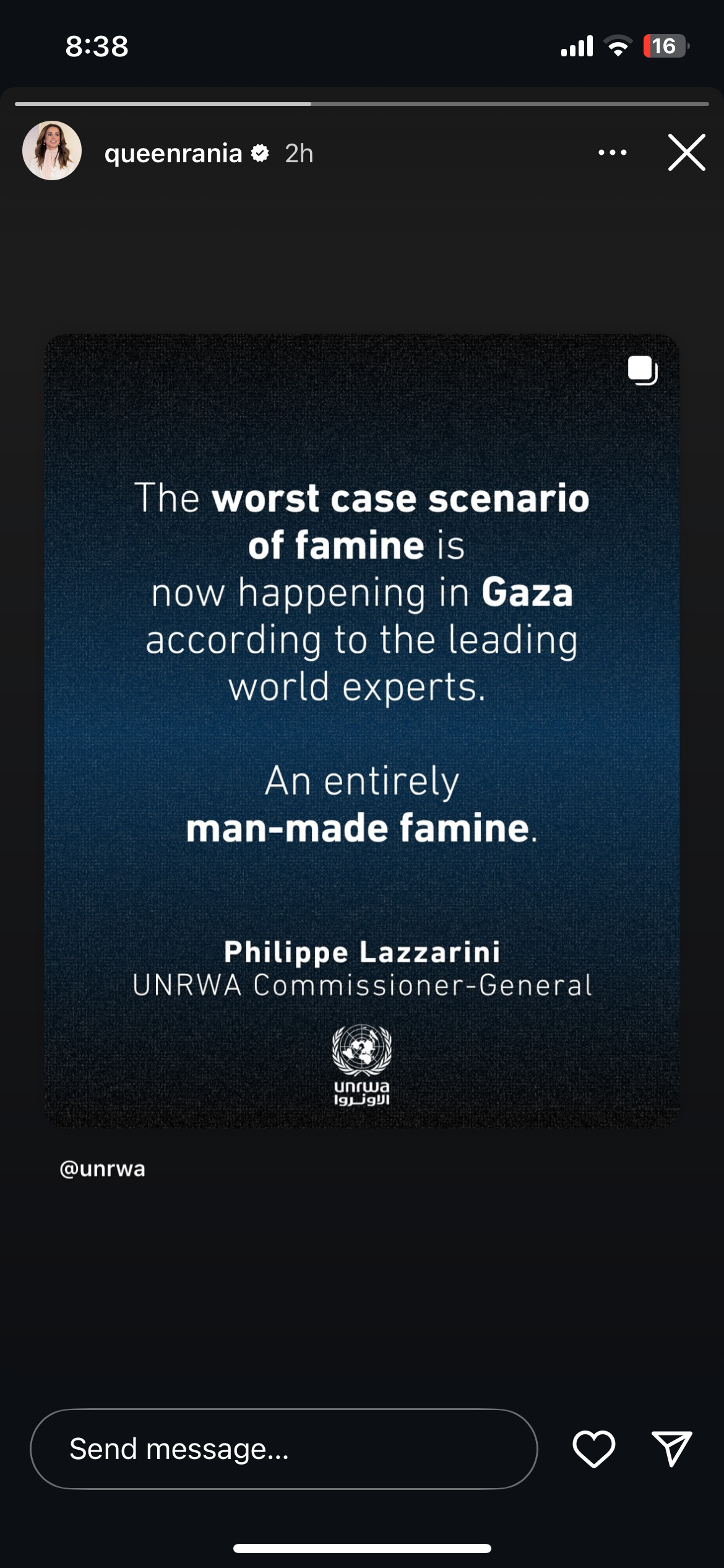 وجاء في التصريح الذي أعادت الملكة نشره على منصاتها: "أسوأ سيناريو للمجاعة يحدث الآن في غزة، بحسب كبار الخبراء العالميين"، وفقًا لما قاله المفوض العام للأونروا، فيليب لازاريني.