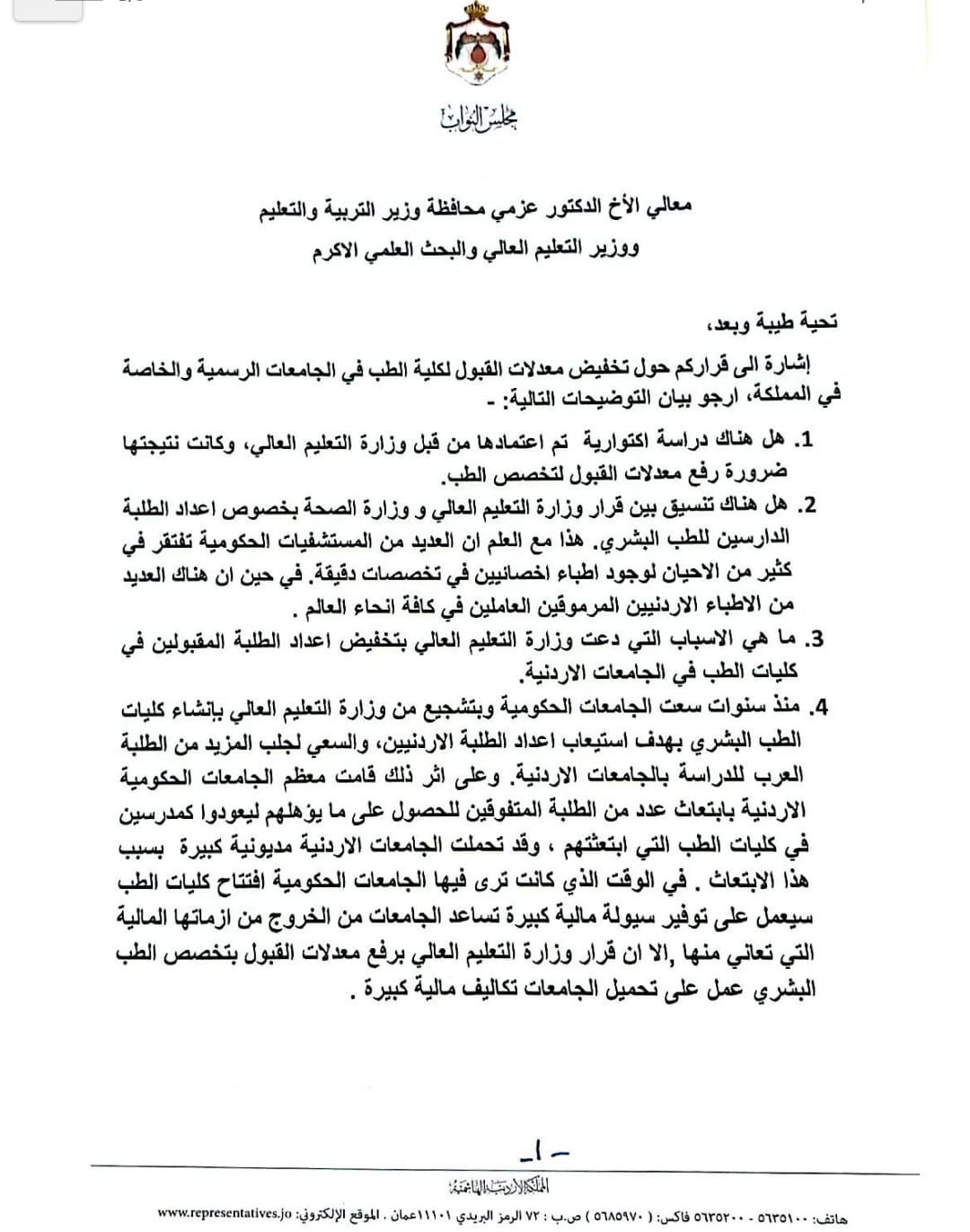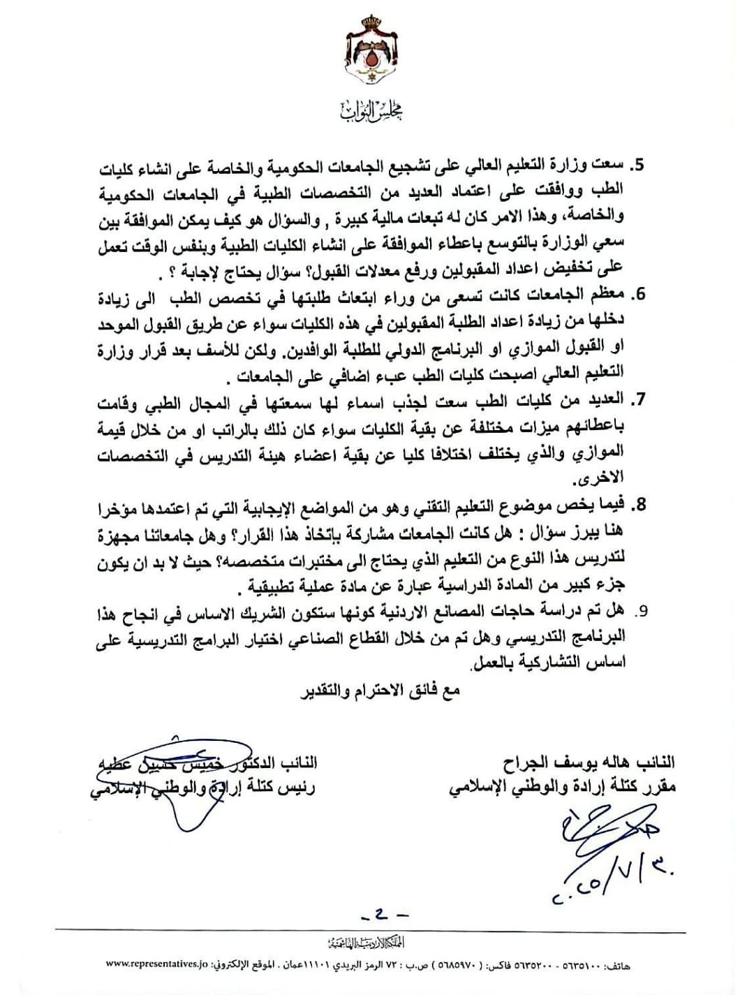 2.هل هناك تنسيق بين قرار وزارة التعليم العالي و وزارة الصحة بخصوص اعداد الطلبة الدارسين للطب البشري. هذا مع العلم ان العديد من المستشفيات الحكومية تفتقر في كثير من الاحيان لوجود اطباء اخصائيين في تخصصات دقيقة. في حين ان هناك العديد من الاطباء الاردنيين المرموقين العاملين في كافة انحاء العالم .