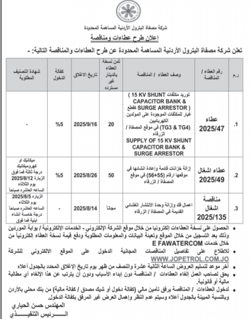 عطاءات صادرة عن شركة مصفاة البترول الاردنية