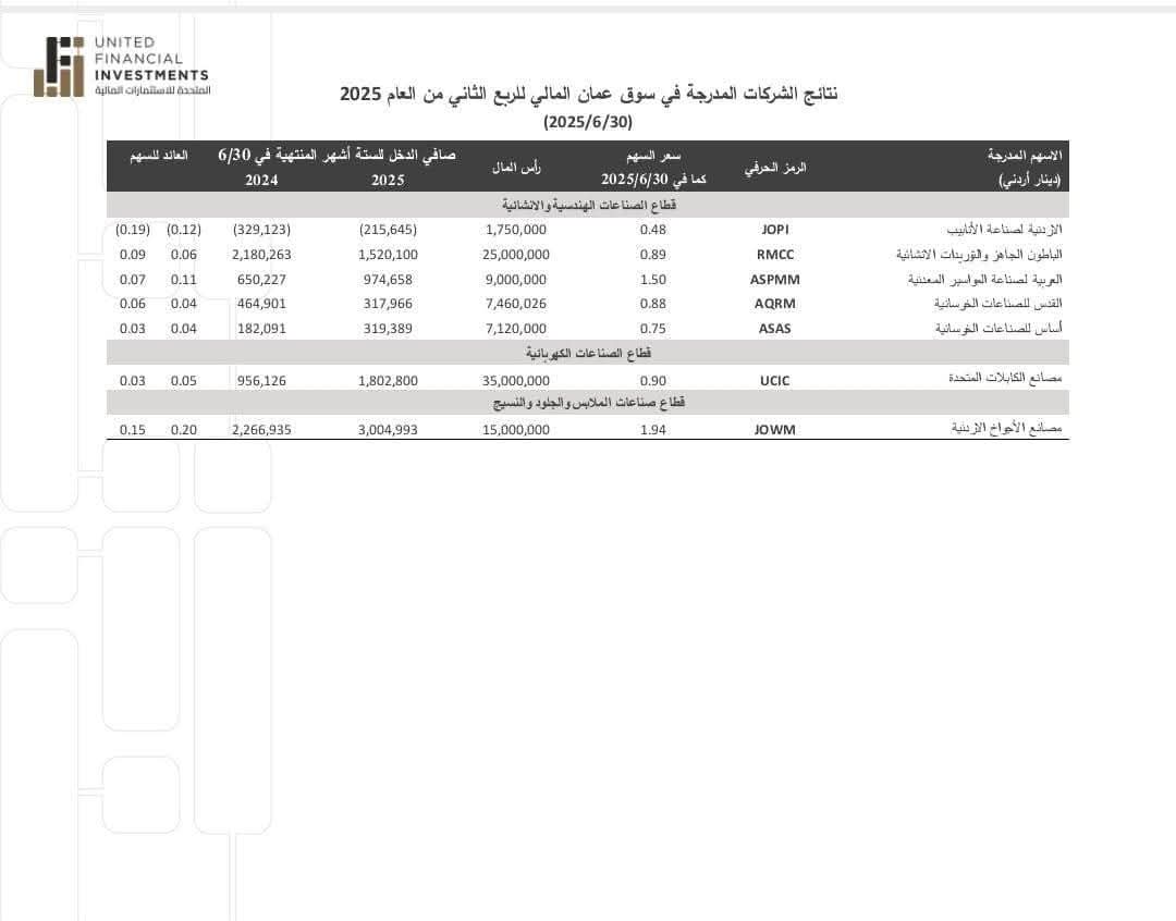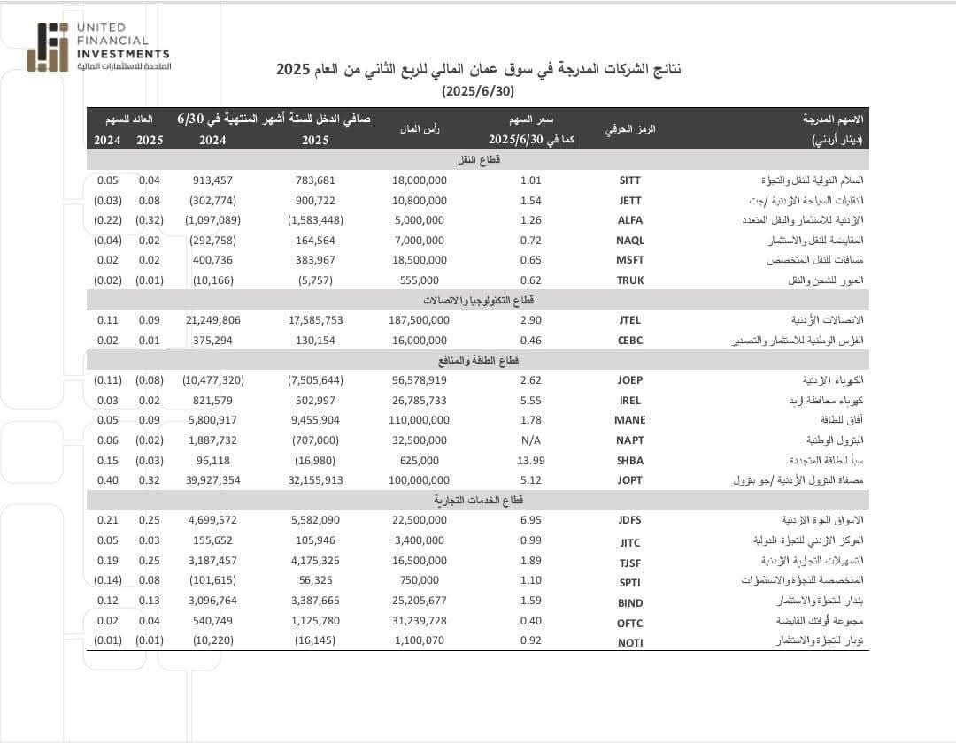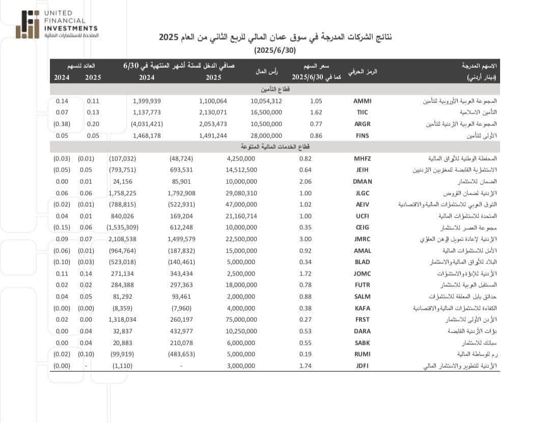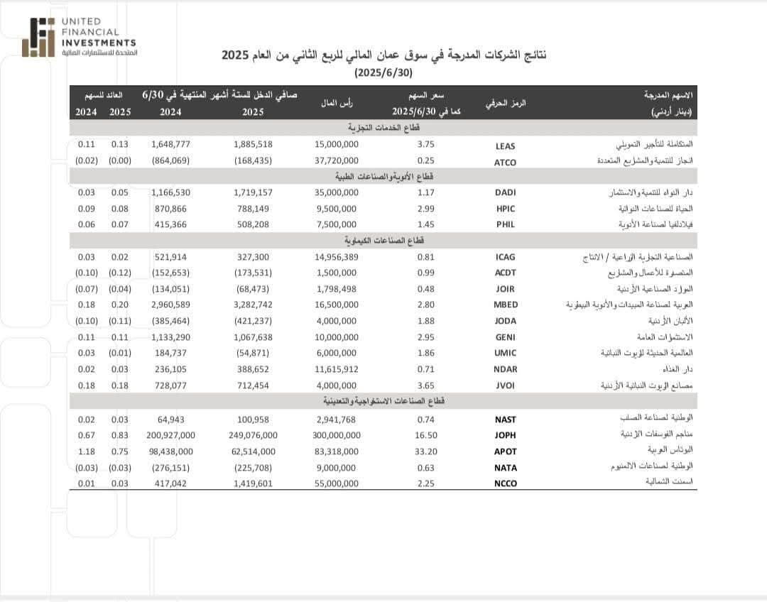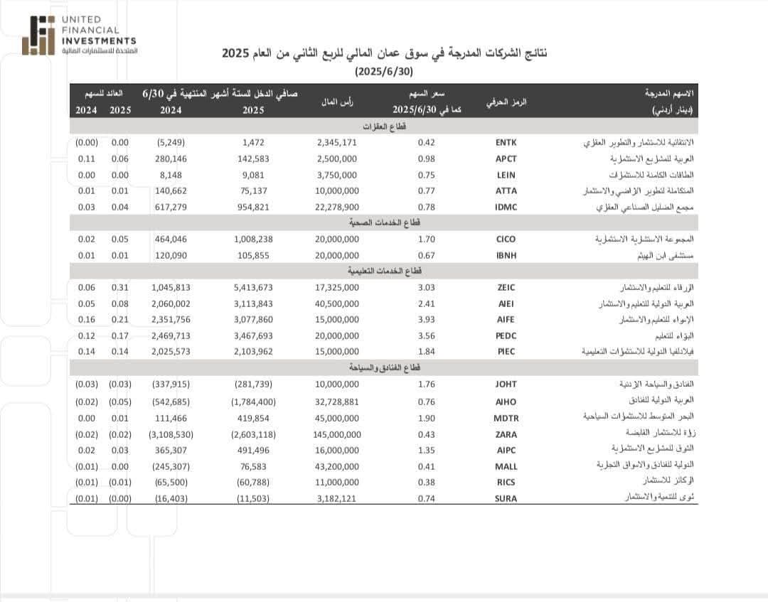 تالياً نتائج الشركات المدرجة في سوق عمان المالي للربع الثاني من العام 2025 مع اغلاقات أسعار اسهمها :