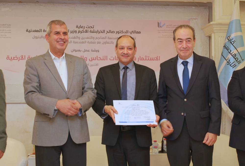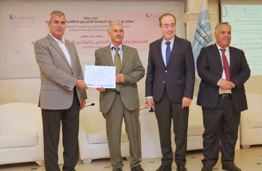 جاء ذلك خلال رعايته ورشة العمل التي نظمتها شعبة هندسة المناجم والتعدين والهندسة الجيولوجية والبترول في نقابة المهندسين الأردنيين بالتعاون مع شعبة الهندسة الكيميائية، تحت عنوان: "الاستثمار في خامات النحاس والعناصر الأرضية النادرة في الأردن".