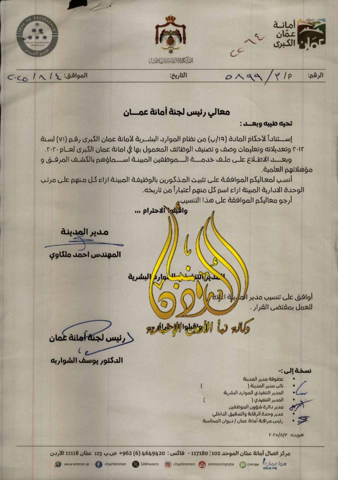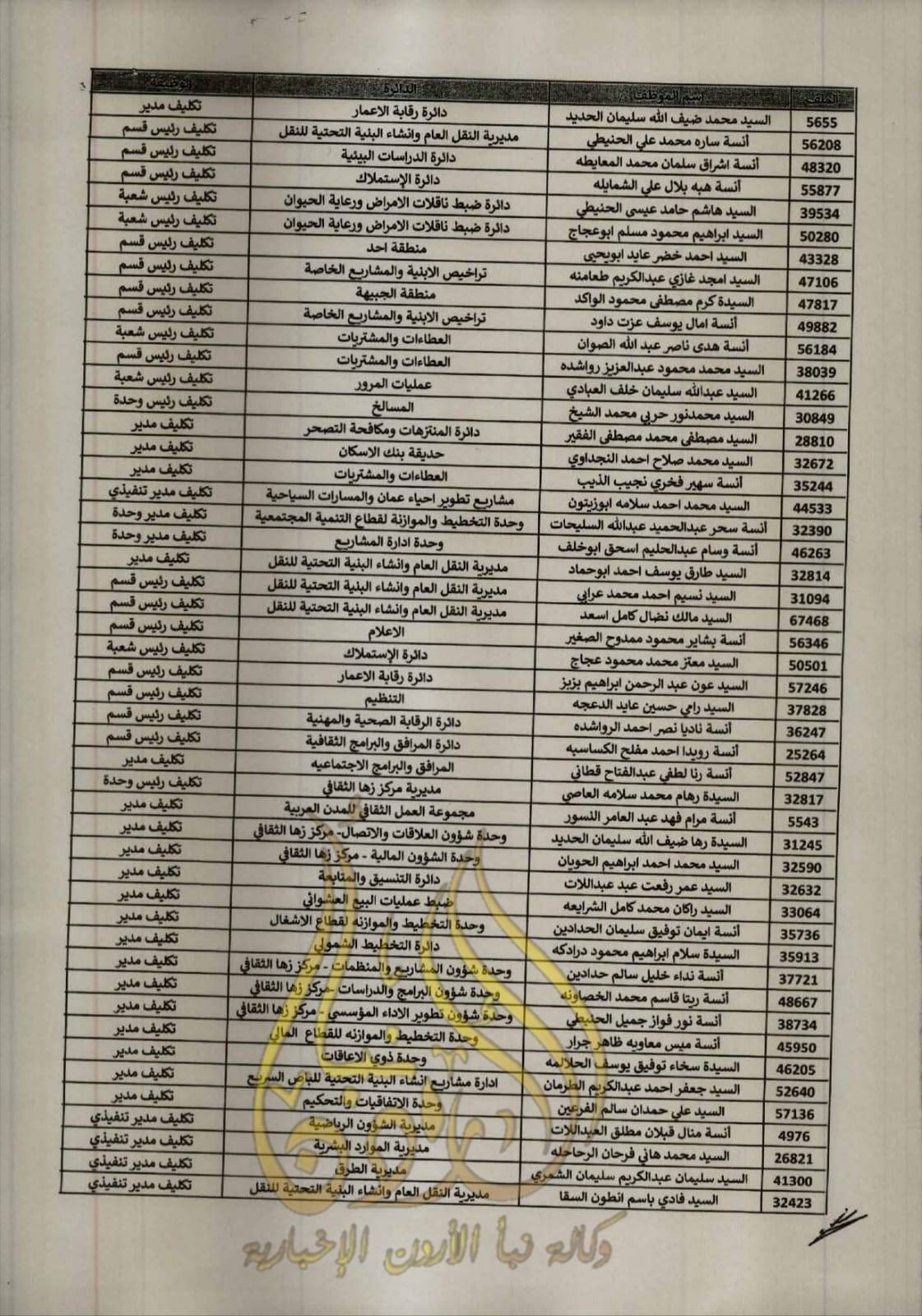 قرر رئيس لجنة أمانة عمان الكبرى الدكتور يوسف الشواربة الموافقة على تثبيت موظفين بوظائف مدراء ورؤساء أقسام وشعب.