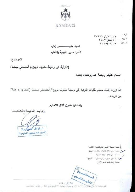 قررت وزارة التربية والتعليم إلغاء جميع طلبات الترقية المقدّمة إلى وظيفة مشرف تربوي / أخصائي مبحث (المخزون)، وذلك اعتبارًا من تاريخ 2025/8/5.