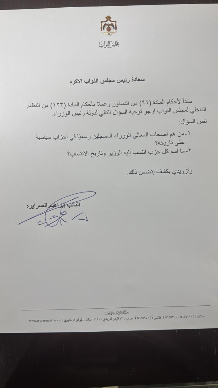 وجه النائب إبراهيم الصرايرة سؤالاً نيابياً إلى دولة رئيس الوزراء، يستوضح فيه عن أسماء الوزراء المنتمين رسميًا إلى أحزاب سياسية حتى تاريخه.