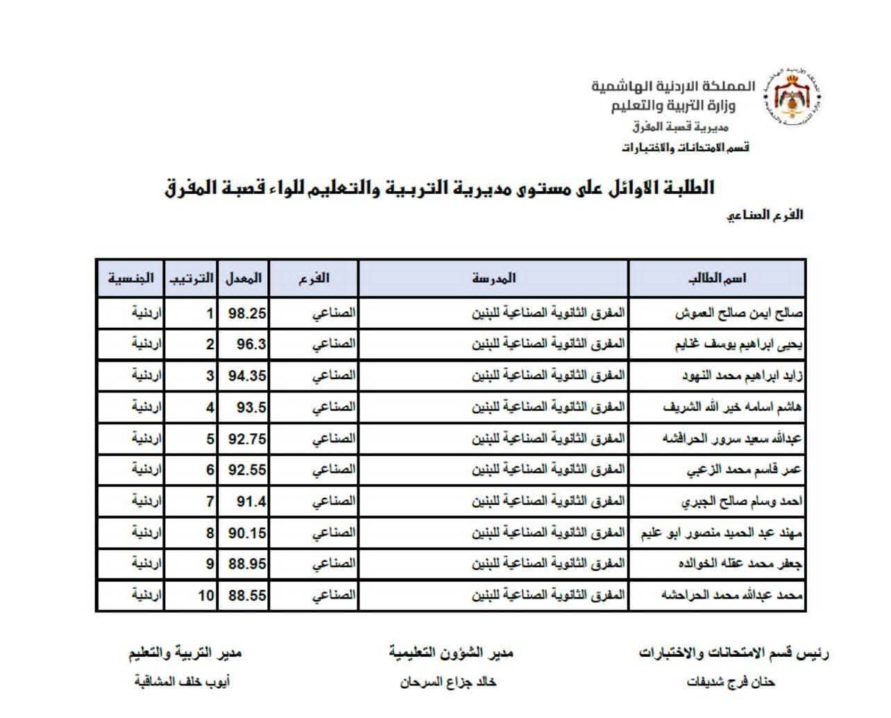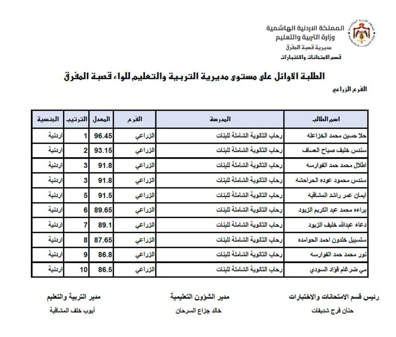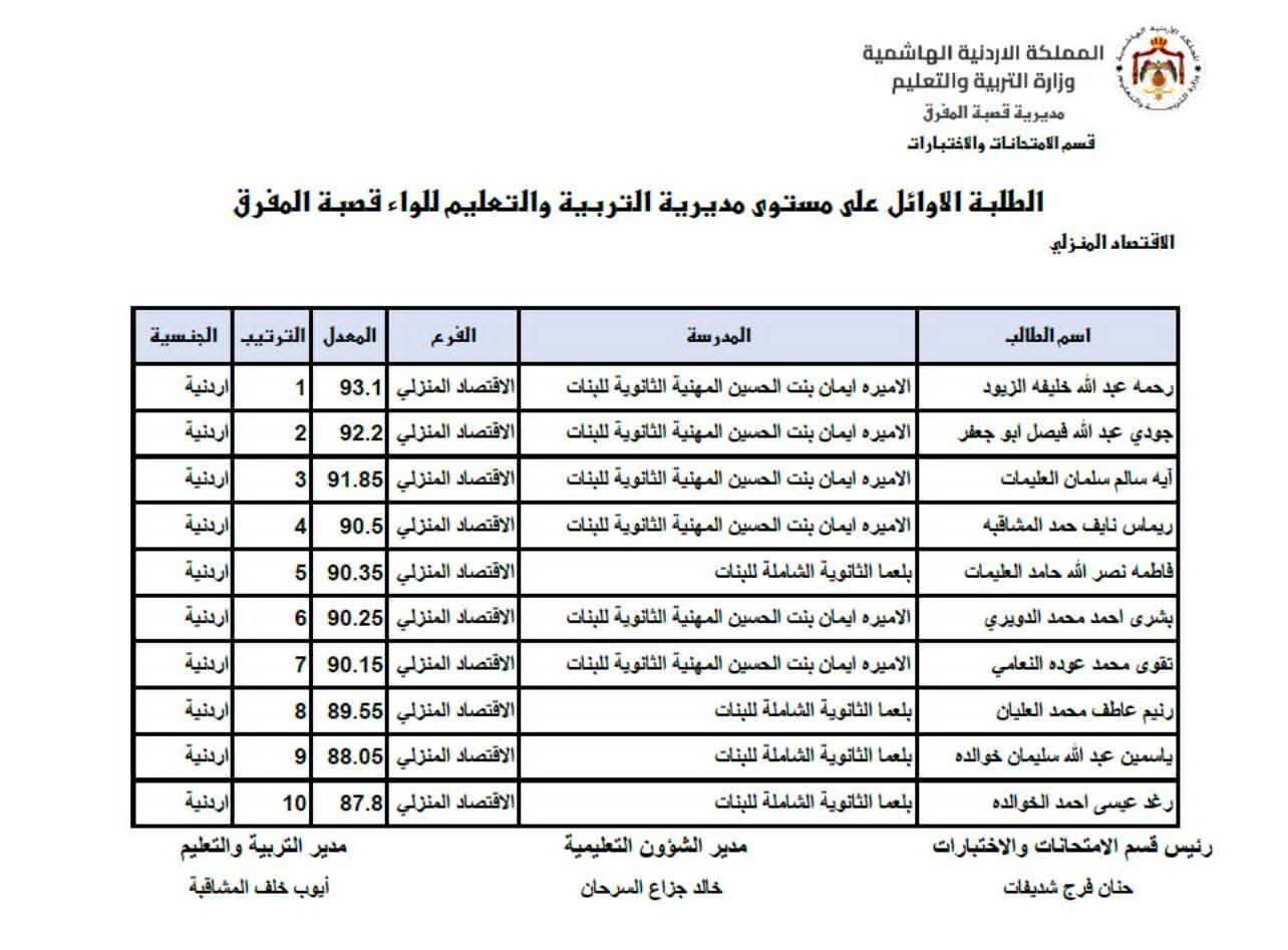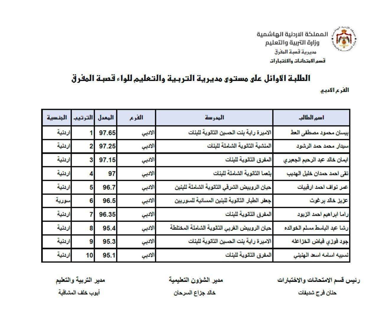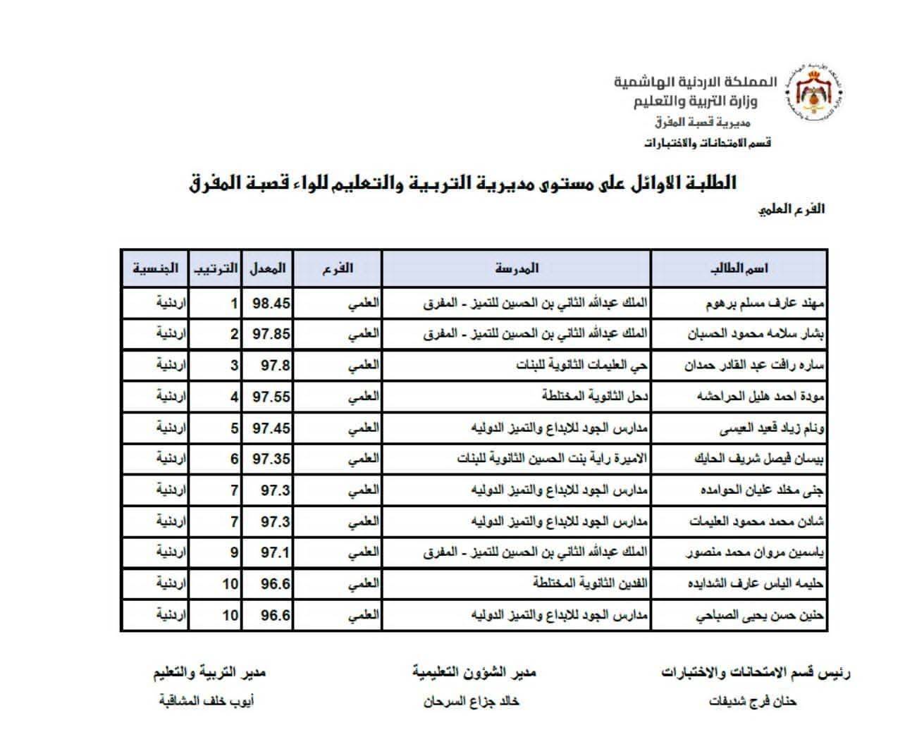 تالياً أسماء أوائل التوجيهي في لواء قصبة المفرق :