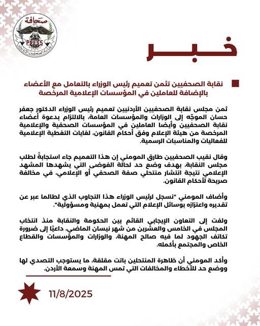 وقال نقيب الصحفيين طارق المومني إن هذا التعميم جاء استجابةً لطلب مجلس النقابة، بهدف وضع حد لحالة الفوضى التي يشهدها المشهد الإعلامي نتيجة انتشار منتحلي صفة الصحفي أو الإعلامي، في مخالفة صريحة لأحكام القانون.