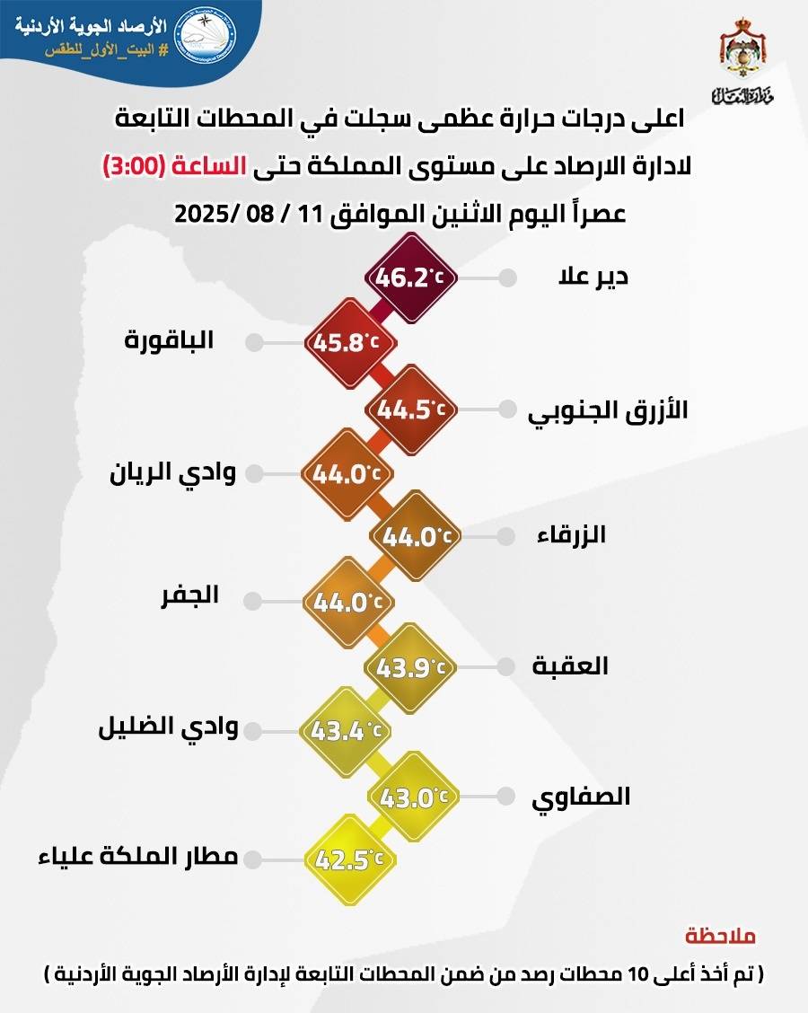 سجلت محطة دير علا، الاثنين، أعلى درجة حرارة على مستوى المملكة بـ 46.2 درجة مئوية، تلتها الباقورة بتسجيلها 45.8 درجة مئوية، وفق ما أعلنت إدارة الأرصاد الجوية.
