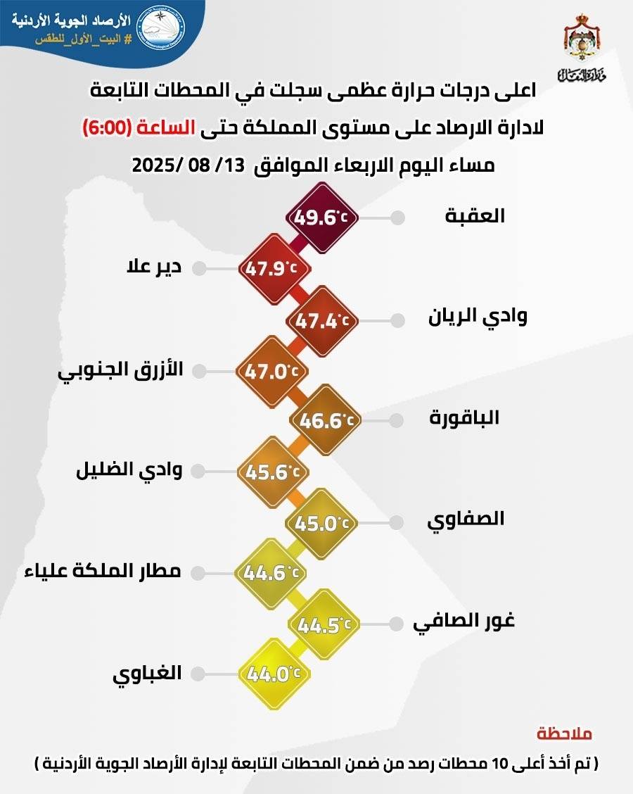 أعلنت إدارة الأرصاد الجوية أنّ منطقة مطار الملك حسين في محافظة العقبة، سجلت اليوم الأربعاء، رقمًا قياسيًا لدرجة الحرارة العظمى حيث بلغت 49.6 مئوية، متجاوزة الرقم السابق البالغ 48.5 المسجل عام 2020.