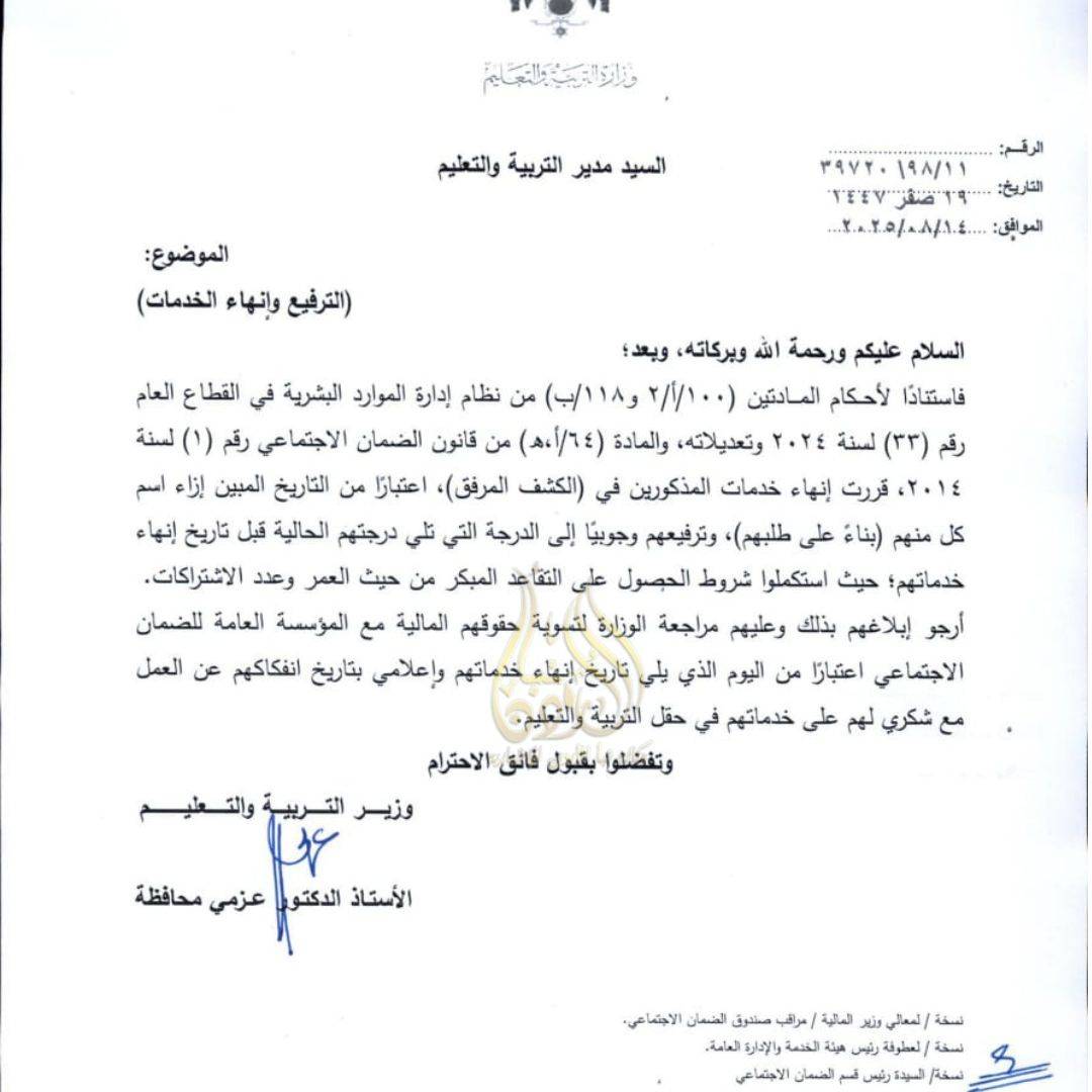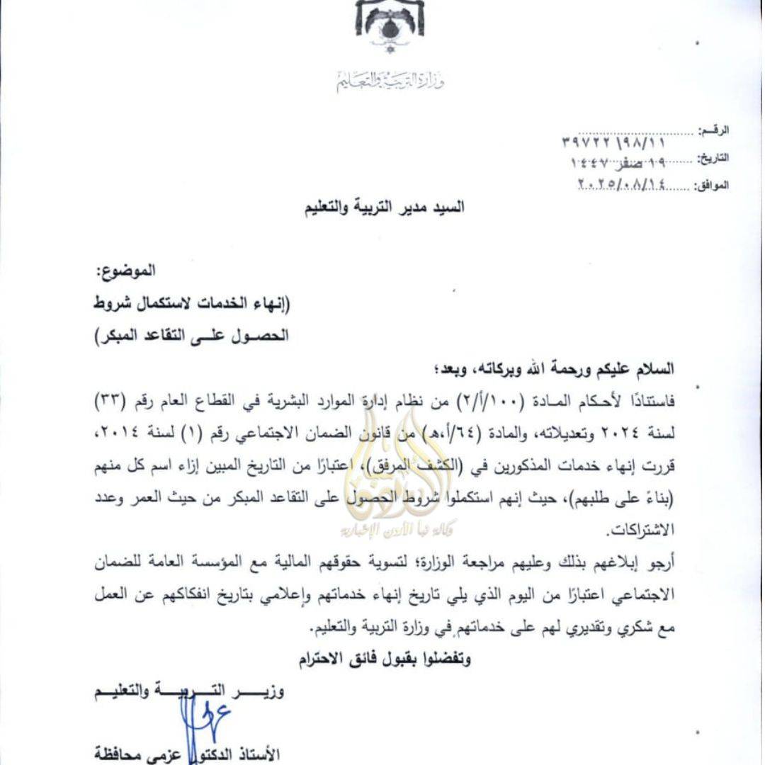 قرر وزير التربية والتعليم الاستاذ الدكتور عزمي محافظة إنهاء خدمات موظفين في الوزارة، بناء على طلبهم، بعد إنهائهم متطلبات التقاعد المبكر.