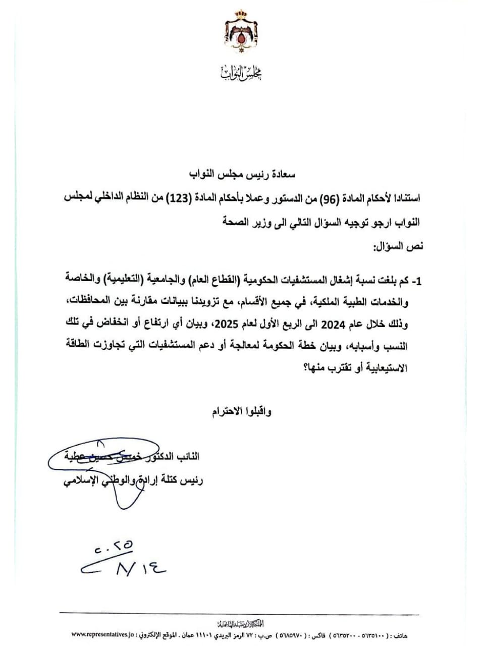 1-كم بلغت نسبة إشغال المستشفيات الحكومية (القطاع العام) والجامعية (التعليمية) والخاصة والخدمات الطبية الملكية، في جميع الأقسام، مع تزويدنا ببيانات مقارنة بين المحافظات، وذلك `خلال عام 2024 الى الربع الأول لعام 2025، وبيان أي ارتفاع أو انخفاض في تلك النسب وأسبابه، وبيان خطة الحكومة لمعالجة أو دعم المستشفيات التي تجاوزت الطاقة الاستيعابية أو تقترب منها؟