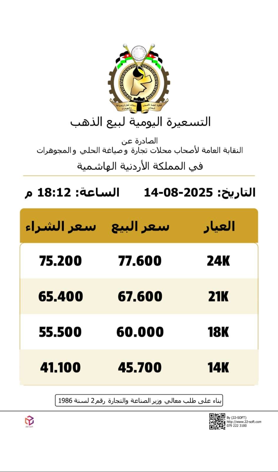 انخفضت أسعار الذهب في الأردن بنحو 60 قرشا وفقا للتسعيرة المسائية للخميس الصادرة من النقابة العامة لأصحاب محلات تجارة وصياغة الحلي والمجوهرات.