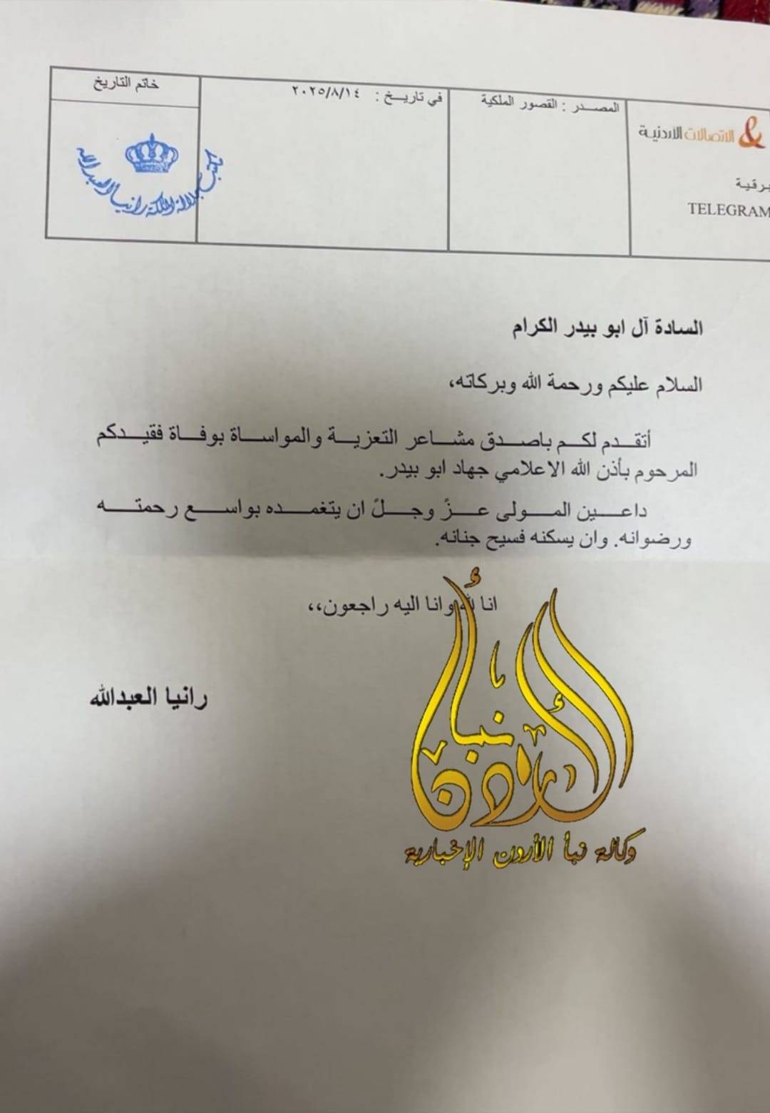 قدّمت جلالة الملكة رانيا العبدالله واجب العزاء لعائلة الصحفي الراحل جهاد أبو بيدر، معربة عن أصدق مشاعر التعزية والمواساة بوفاته.