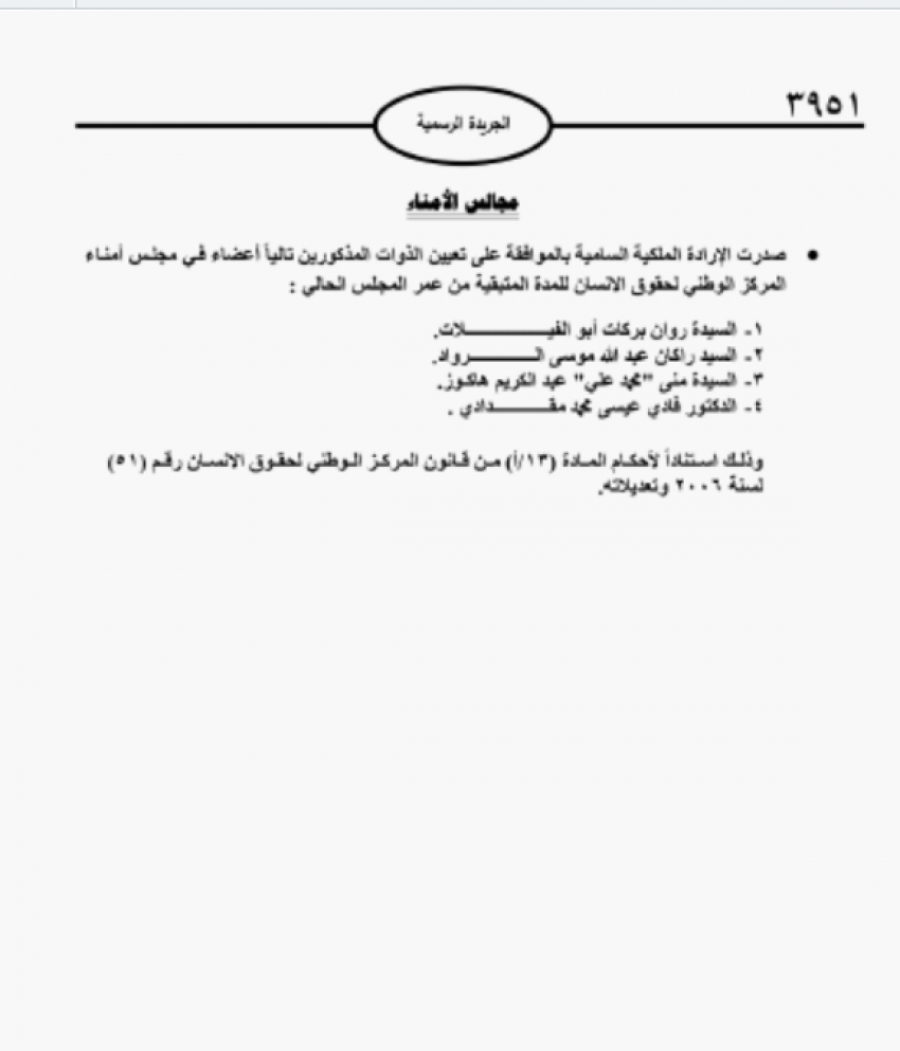 صدرت الإرادة الملكية السامية بالموافقة على تعيين التالية أسماؤهم أعضاء في مجلس أمناء المركز الوطني لحقوق الانسان للمدة المتبقية من عمر المجلس الحالي:
