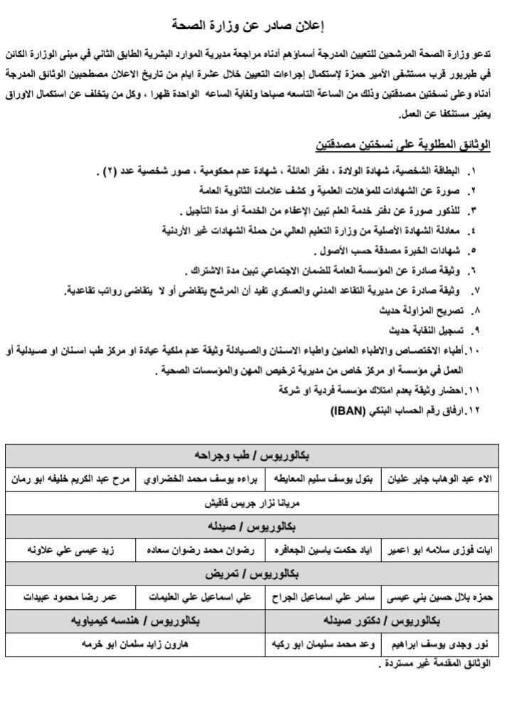 في إعلان رسمي صدر عن وزارة الصحة، تم دعوة عدد من المرشحين للتعيين لمراجعة مديرية الموارد البشرية لاستكمال إجراءات التعيين خلال عشرة أيام من تاريخ الإعلان