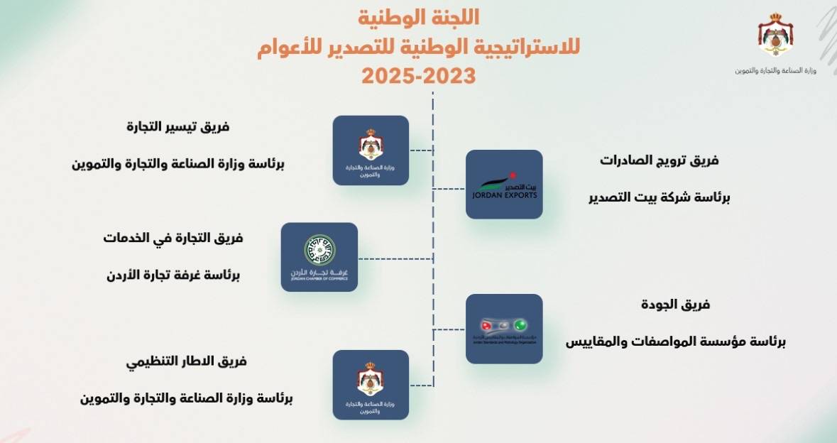 تجدر الإشارة أن الاستراتيجية الوطنية للتصدير (2023 – 2025) والتي تم إقرارها في العام 2023 كجزء من رؤية التحديث الاقتصادي، والتي تعتبر ثمرة جهد تشاركي لتعزيز تنافسية الصادرات، وذلك من خلال خمسة محاور أساسية وهي: معلومات الأسواق، والتسويق والترويج، وإدارة الجودة وتعزيز التنافسية، والتمويل، والإطار القانوني والتنظيمي، ويشرف على تنفيذها فريق وطني برئاسة الأمين العام لوزارة الصناعة والتجارة والتموين.